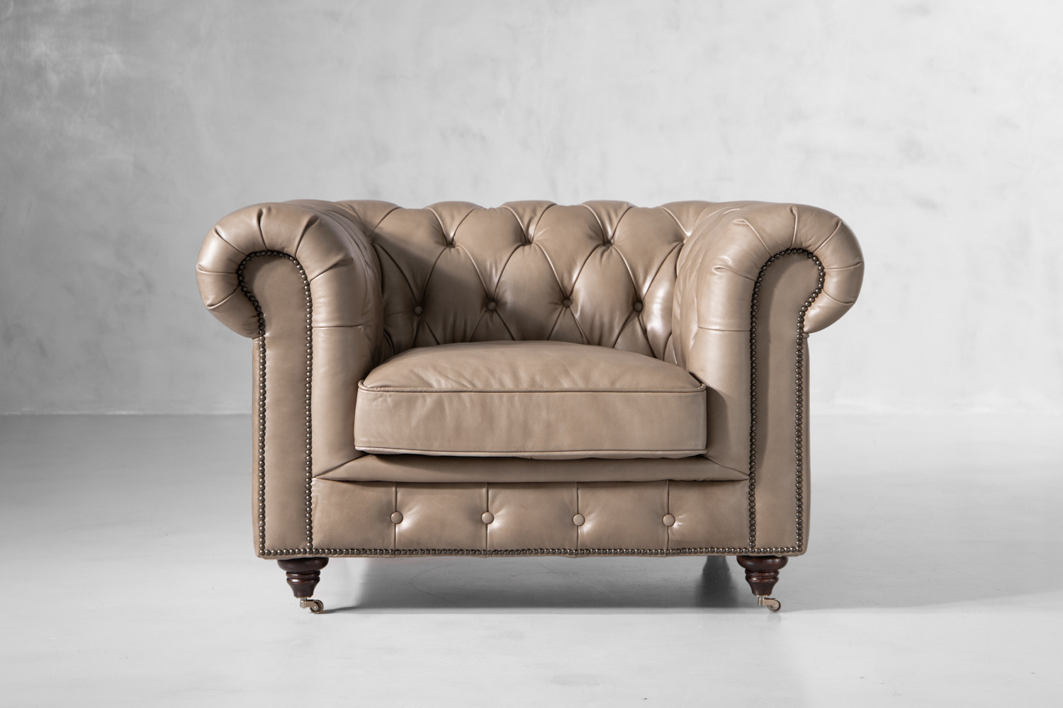 The iconic Jefferson Leather Armchair will command any room with effortless charm. With its iconic deep button tufting, high rolled arms and nail head trim, the design has proved itself as a timeless classic over the years. Our Jefferson Leather Armchair lives up to its reputation, ensuring the feel of suave luxury with its full grain leather upholstery and piano caster front feet.
