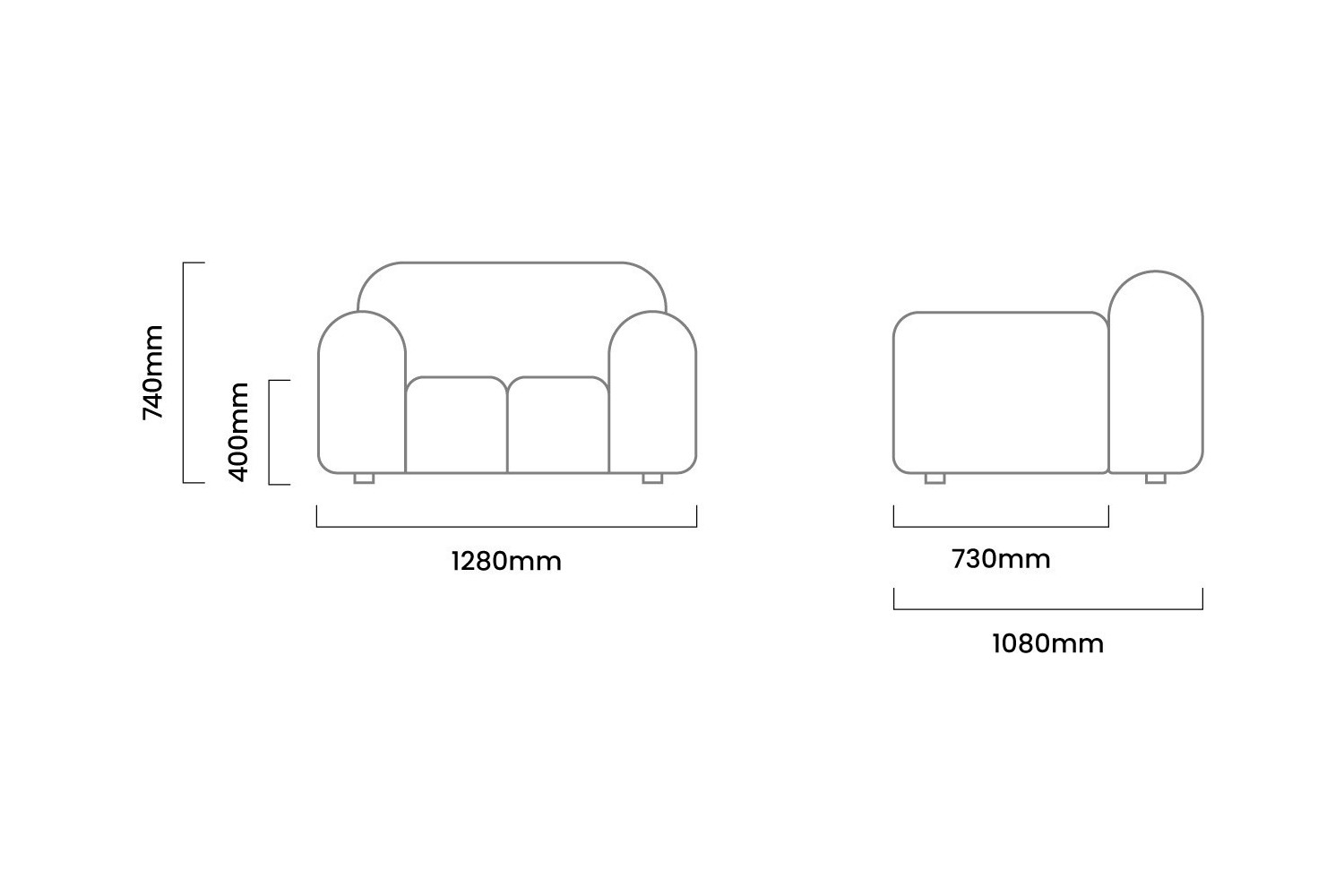 1280mm (L) x 1080mm (W) x 740mm (H) | Seat Height - 400mm | Seat Depth - 730mm