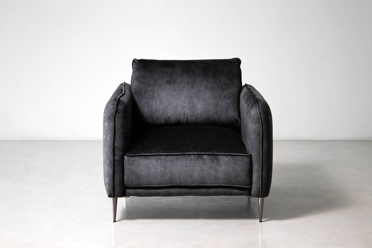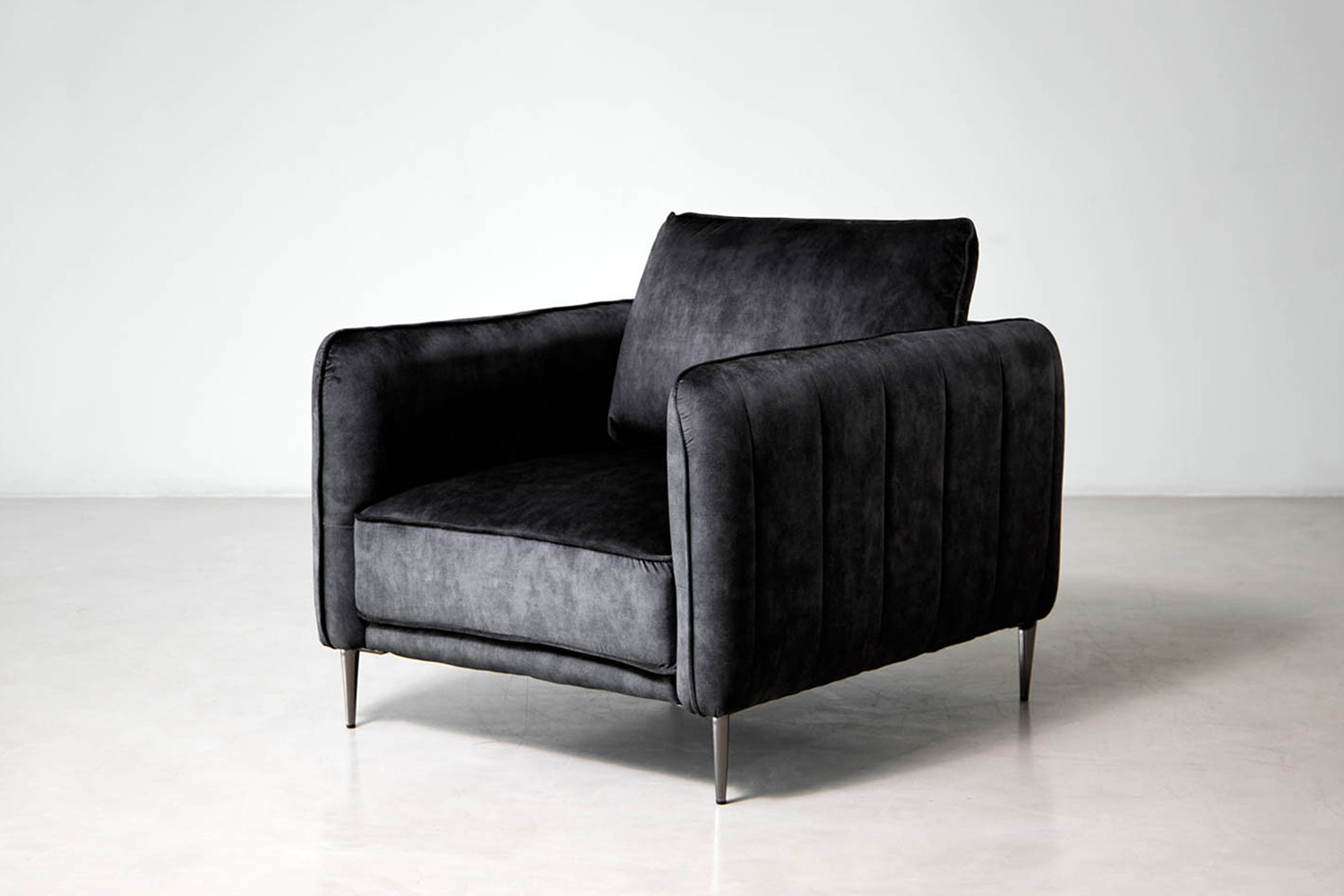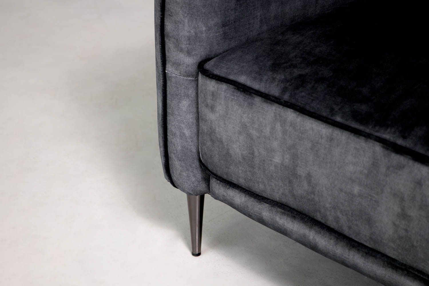 With its Mid-century modern inspired design, this sleek and well-proportioned armchair emphasises easy comfort and clean lines for a simple yet elegant look. High quality velvet upholstery adds a luxurious finish, with tapered steel legs perfectly contrasting and balancing the design overall.