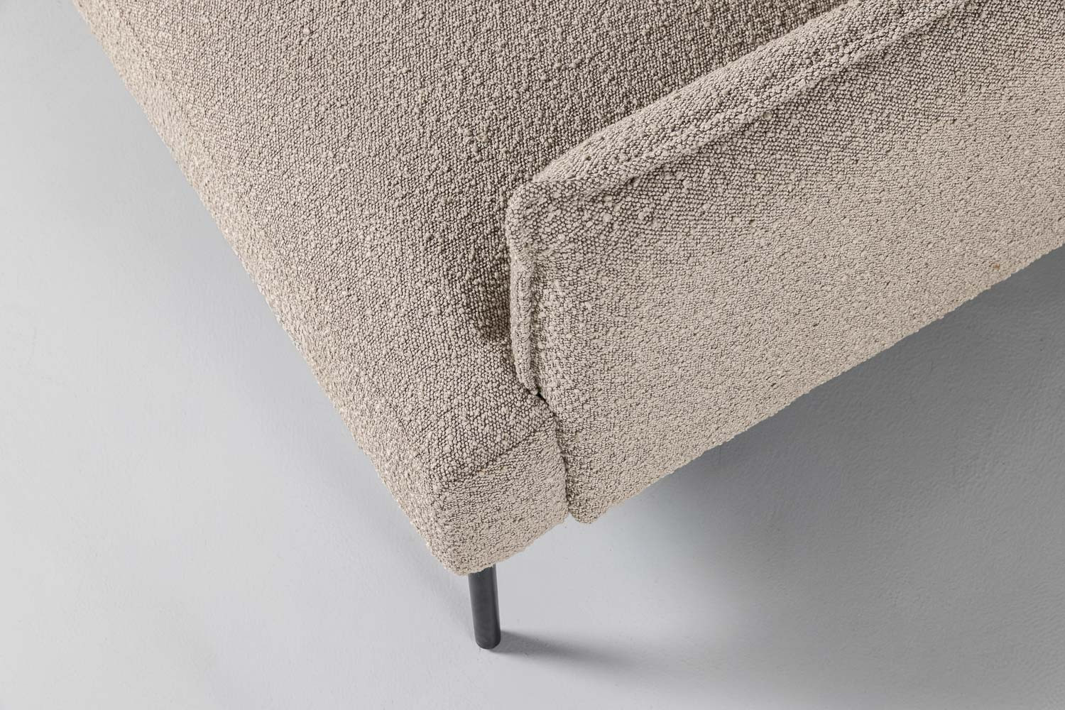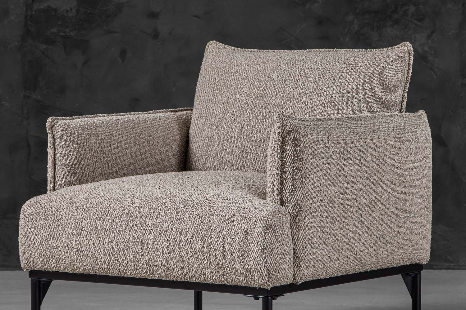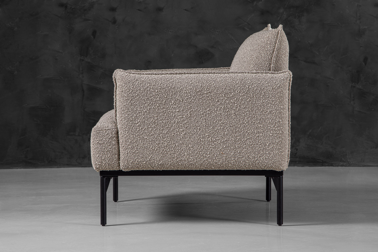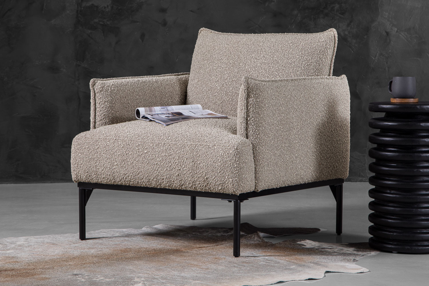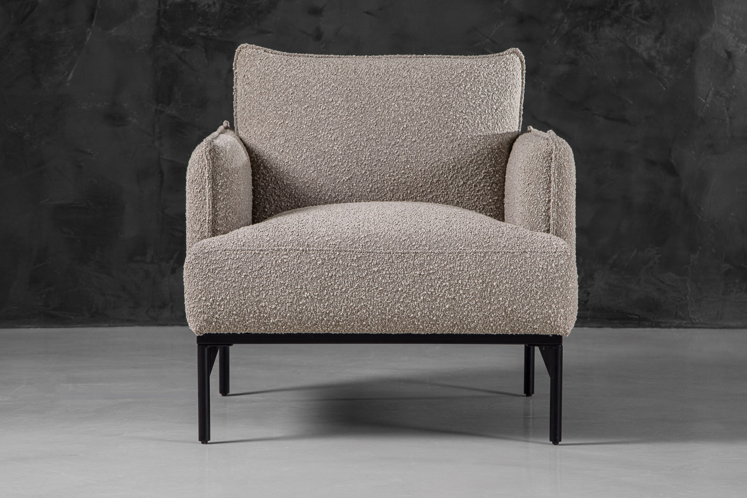 This sleek and stylish armchair is a perfect blend of contemporary design and luxurious comfort. The squared silhouette and clean lines give it a modern look, while the luxurious off-white bouclé upholstery offers a cosy and inviting seat. Reversed seam stitching adds a touch of originality to the design, while the black steel legs give it a minimalist yet sturdy look.