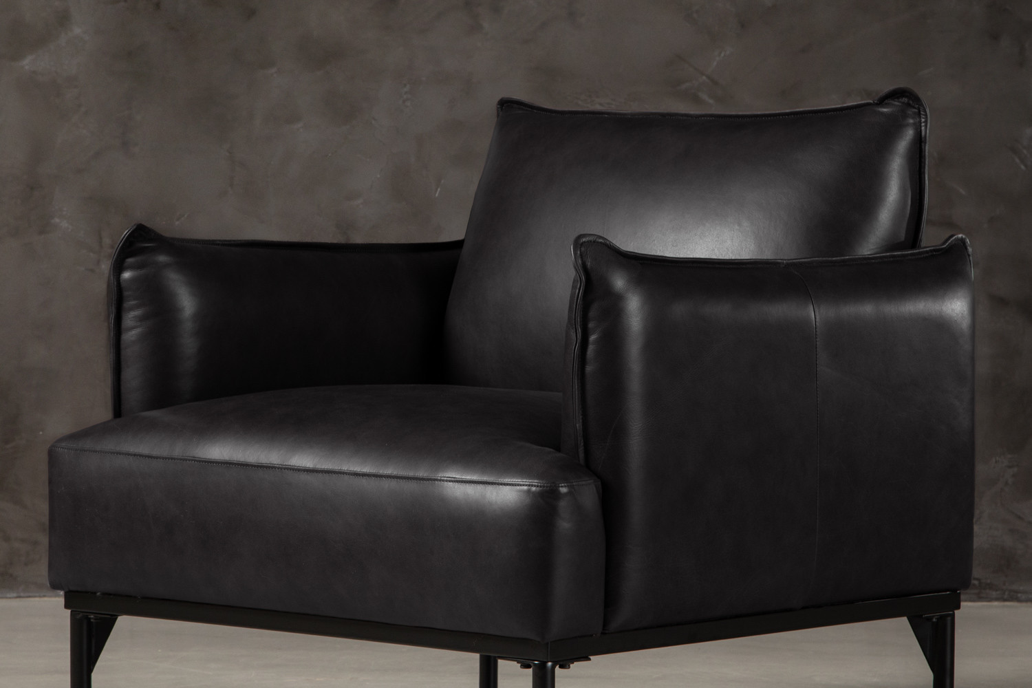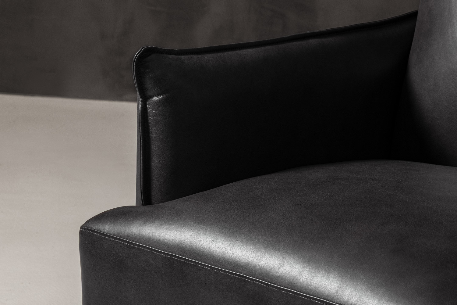 This sleek and stylish armchair is a perfect blend of contemporary design and luxurious comfort. The squared silhouette and clean lines give it a modern look, while the rich leather upholstery offers a cosy and inviting seat. Reversed seam stitching adds a touch of originality to the design, while the black steel legs give it a minimalist yet sturdy look.