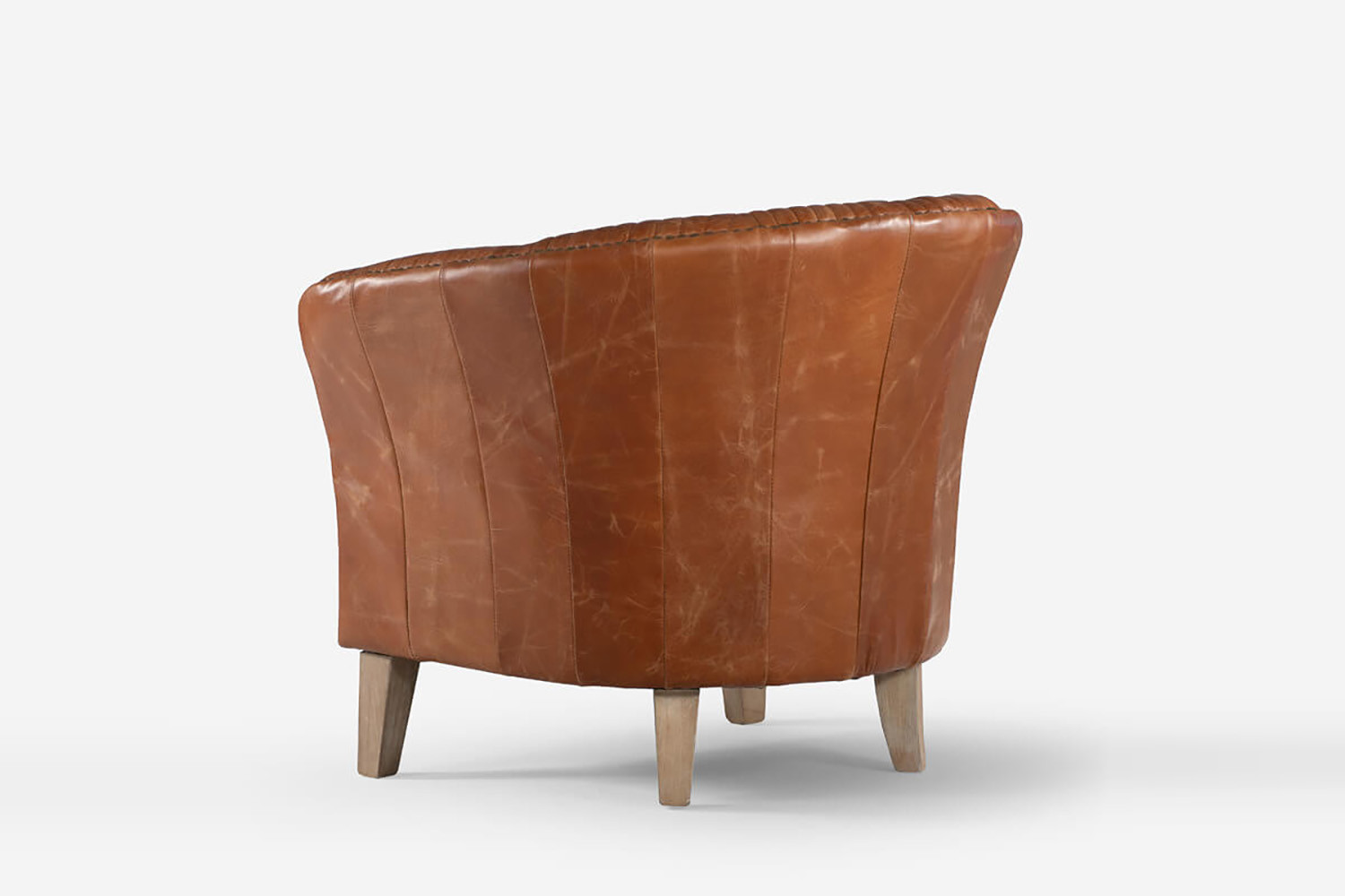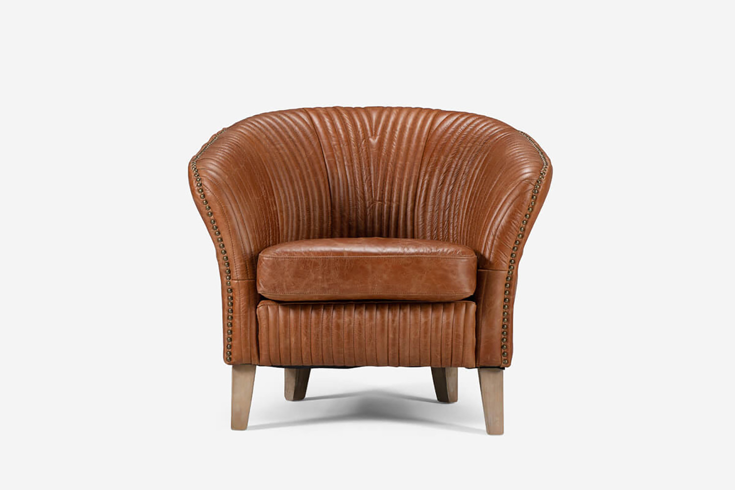 Creatively crafted with top quality full-grain leather and Ash wood, this armchair not only guarantees top quality and durability, but is supremely comfortable with its tub-style design and generous cushioning. Channel stitching and a studded trim finish give this piece added flair as an eye-catching occasional chair that will add inspiration to any space.
