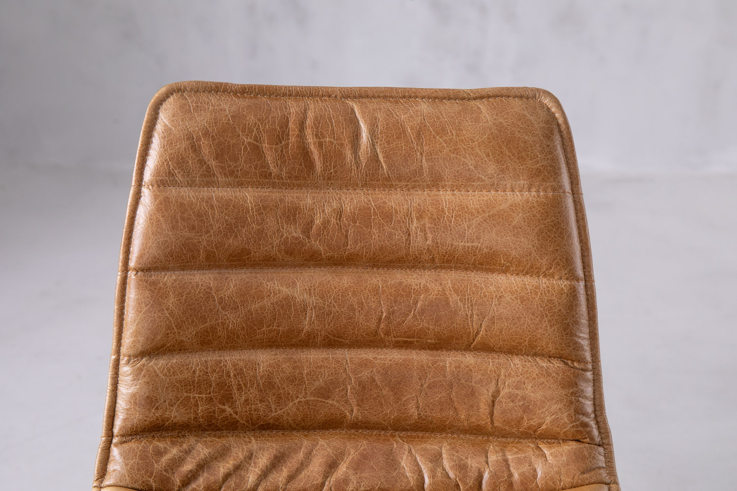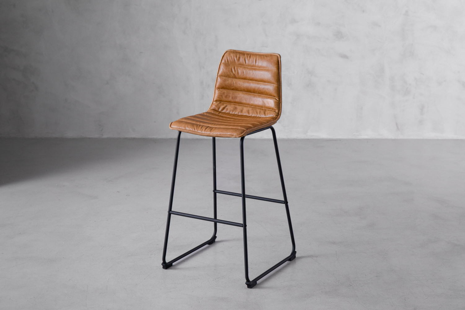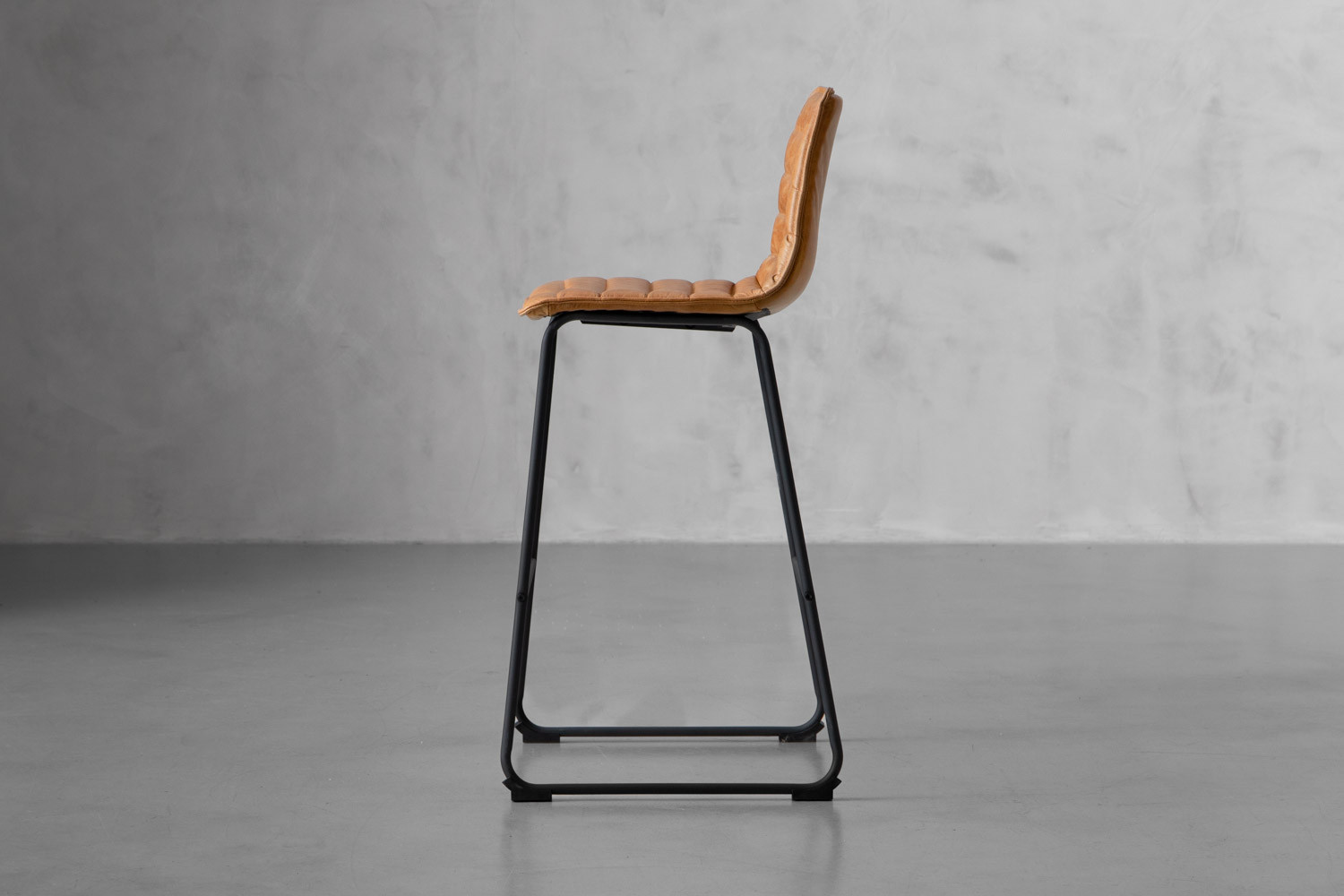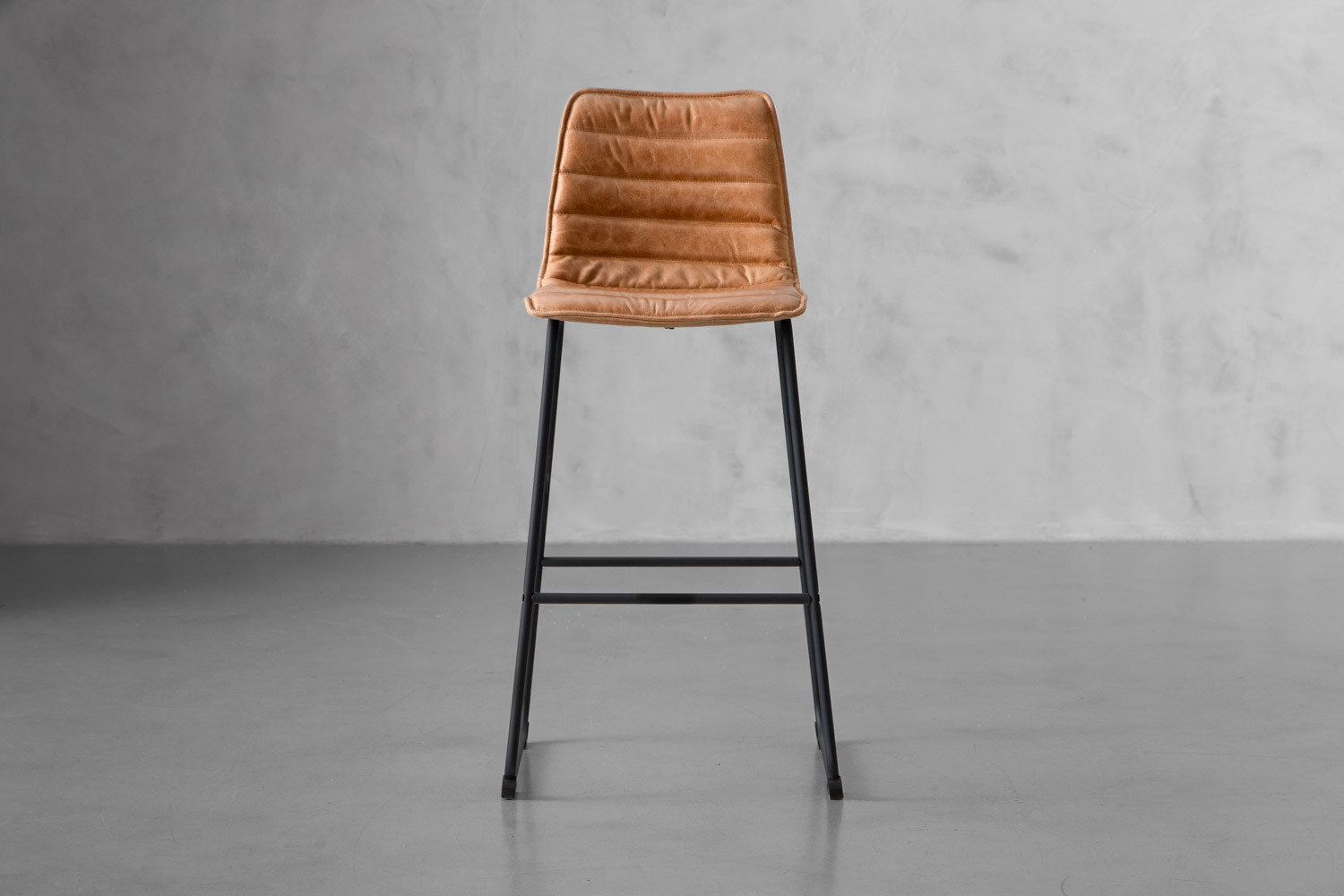 The Bennet Tall Bar Chair perfectly blends style and comfort. Its luxurious tan leather upholstery and sleek black metal frame combine to create a sophisticated look. It was designed to be both elegant and durable, enhancing any bar area with functional charm.