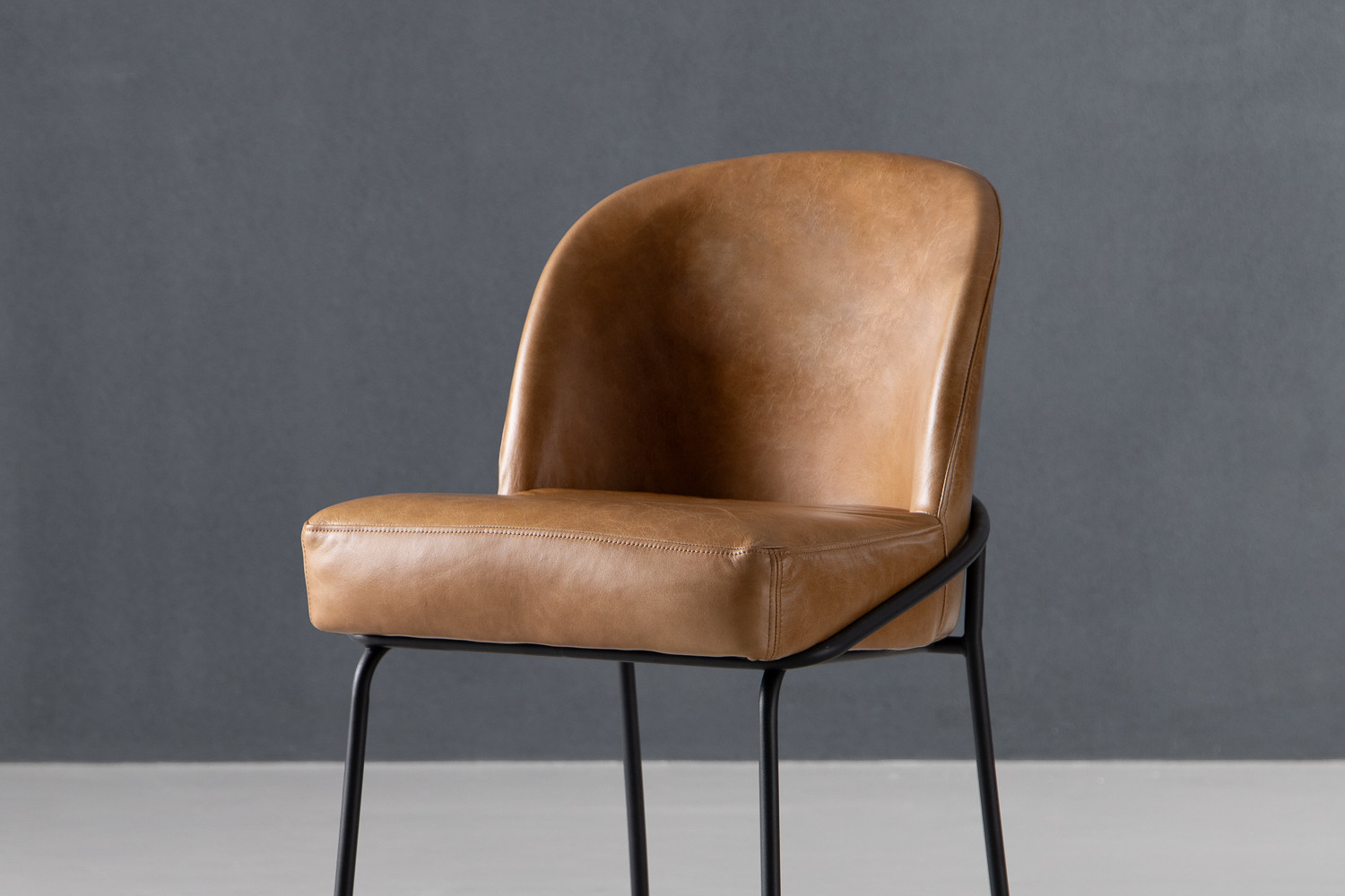 Crafted with a mild steel frame, this chair ensures long-lasting stability and support, while the plush leather seat and backrest deliver an indulgent seating experience. The smooth, curved lines of the chair not only enhance its aesthetic appeal but also provide ergonomic support for prolonged sitting.