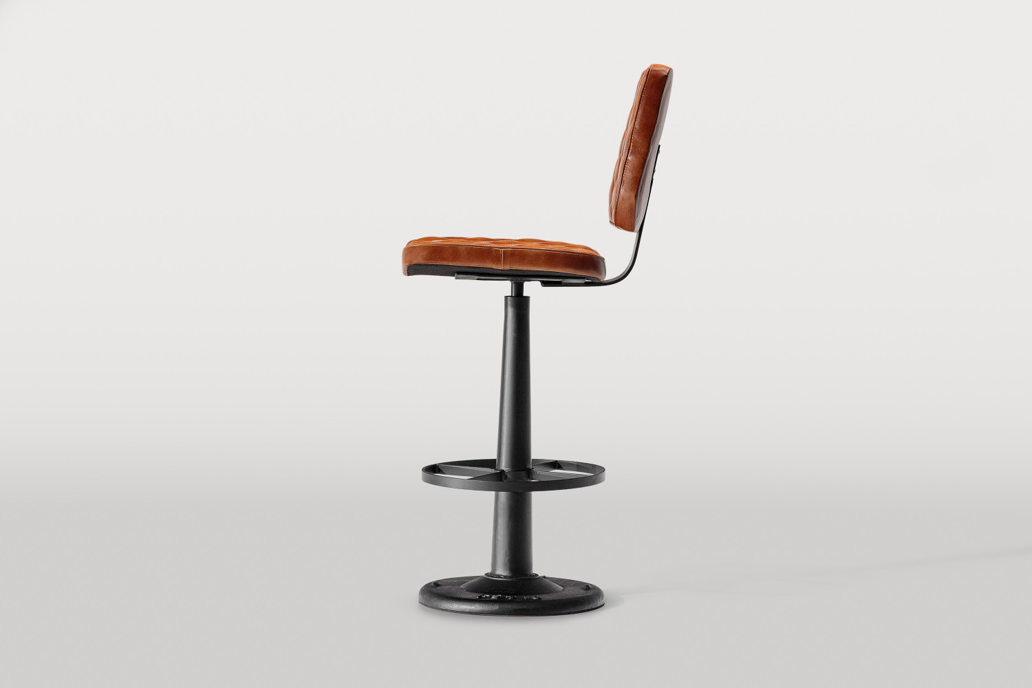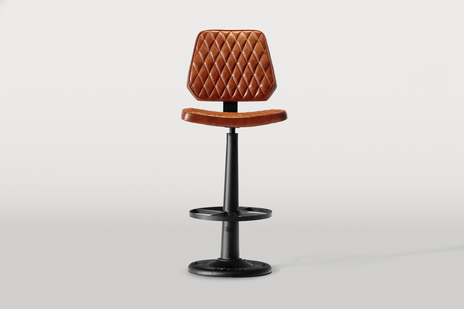 The Damon Bar Stool features luxurious full-grain leather upholstery in a rich brown hue, highlighted by elegant diamond-stitch detailing. The crafted seat is complemented by a black mild steel base with a circular footrest that adds to the stool’s ergonomic profile.