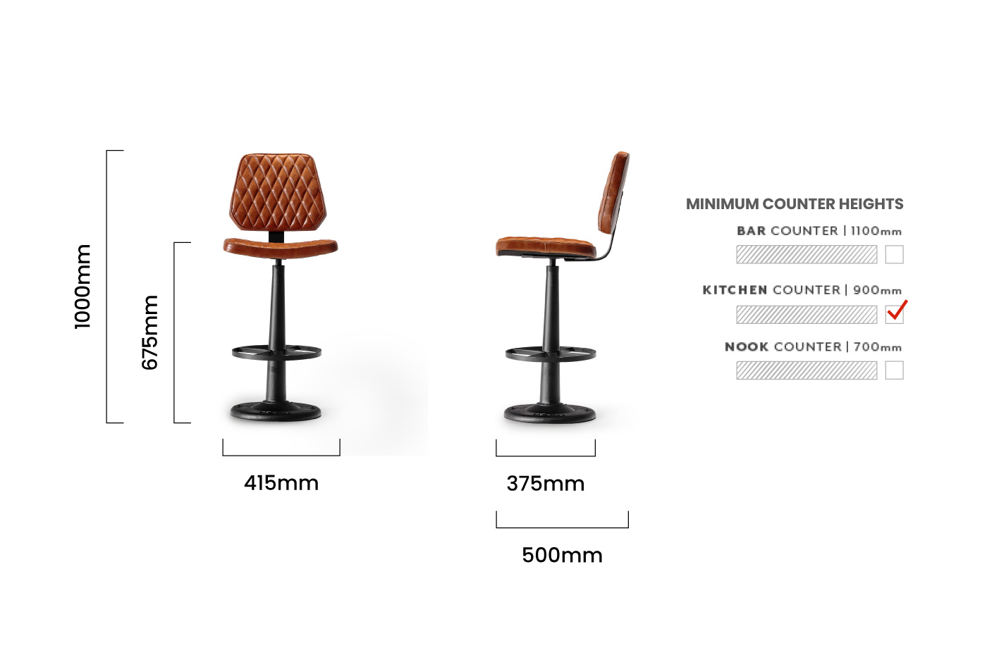 The Damon Counter Leather Bar Stool adds a distinguished edge to your kitchen or entertainment space. With a striking combination of full-grain leather and robust mild steel, it adds a refined feel to any room. Its distinctive diamond-stitch pattern and supportive high backrest round off this stylish piece that’s just waiting to be a part of your next get-together.