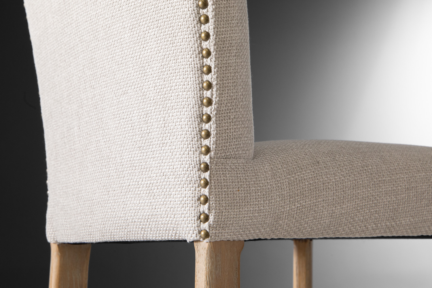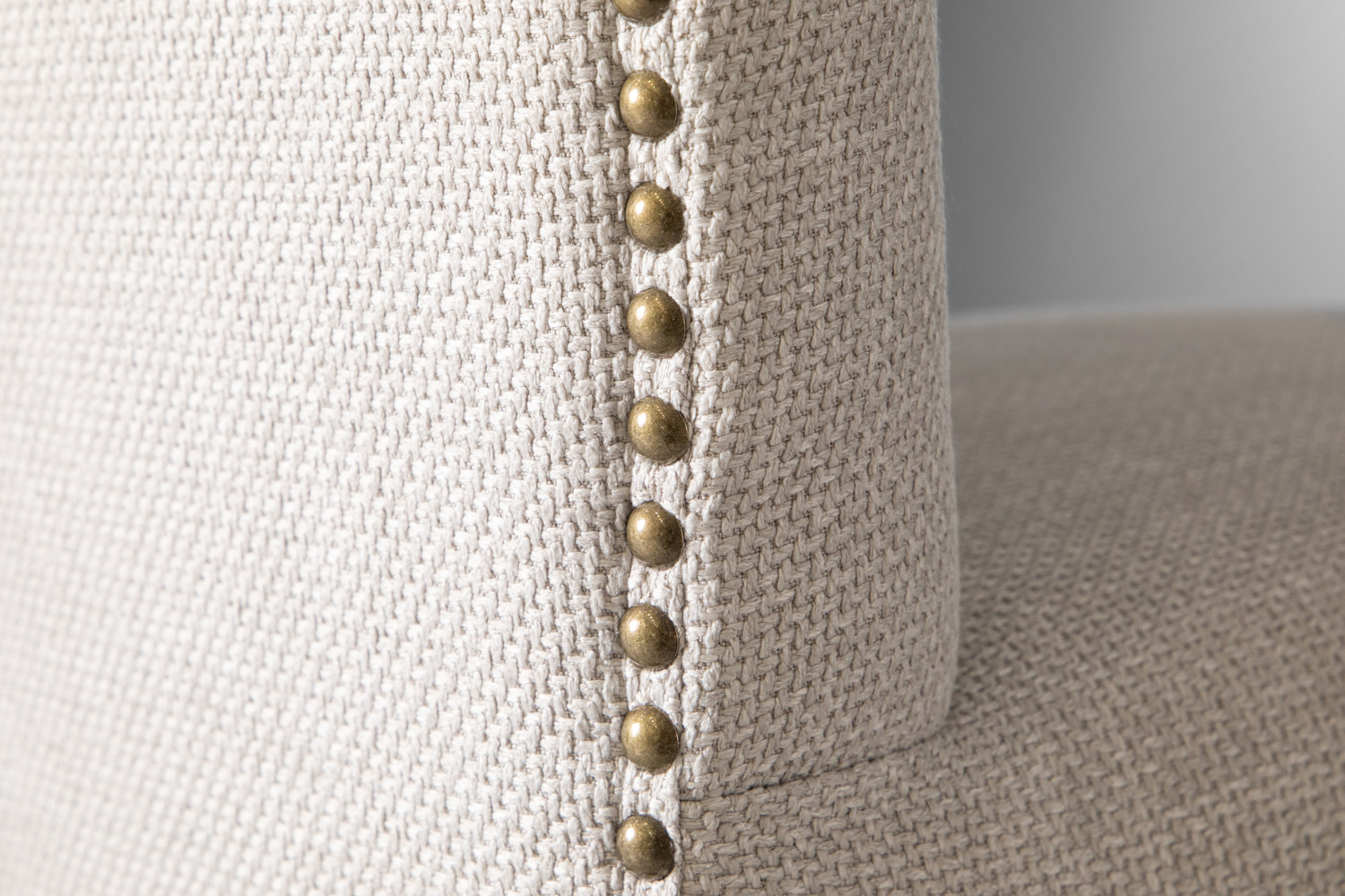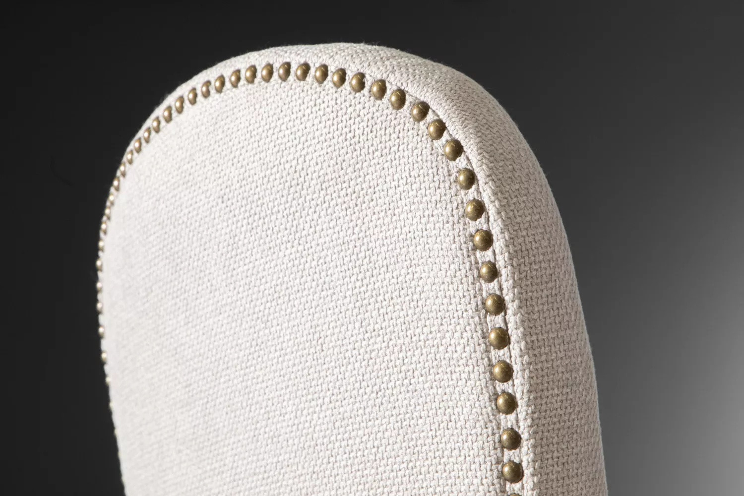 The rounded backrest is carefully shaped to provide ergonomic support, while the soft fabric feels luxurious to the touch. The standout feature is the antique-inspired studded detailing, which frames the backrest and brings a refined yet subtle elegance to the chair. The studs add texture and interest to an otherwise smooth and minimalist design, making this chair the perfect statement piece for any type of interior.