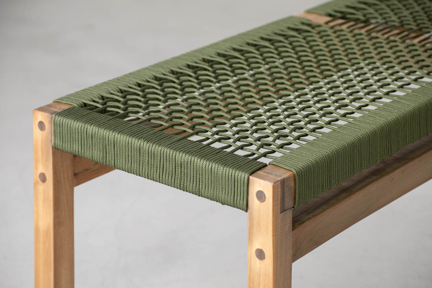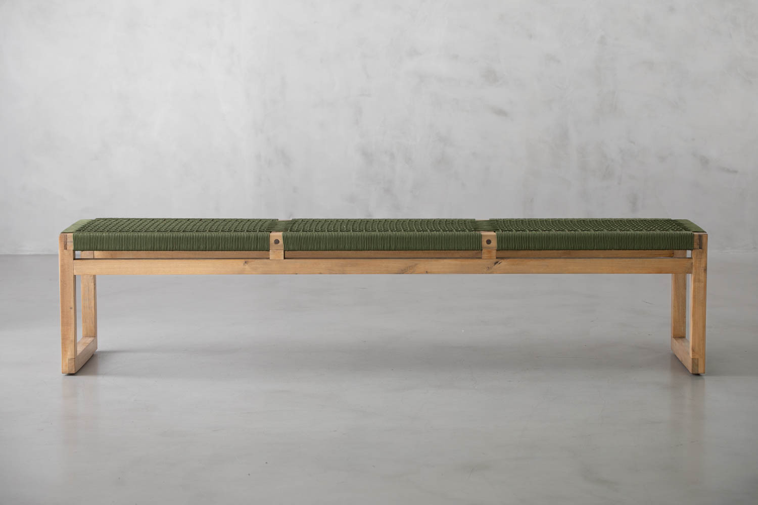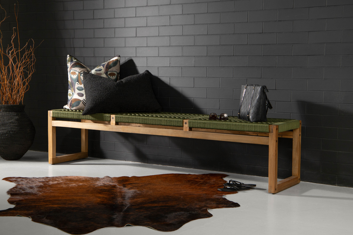Elevate your home with the Kingston Bench's sleek lines and refined military green weave. Its poplar framework introduces an organic touch, blending seamlessly into modern interiors. The high tea finish allows for a unique patina, giving each table a unique hue.