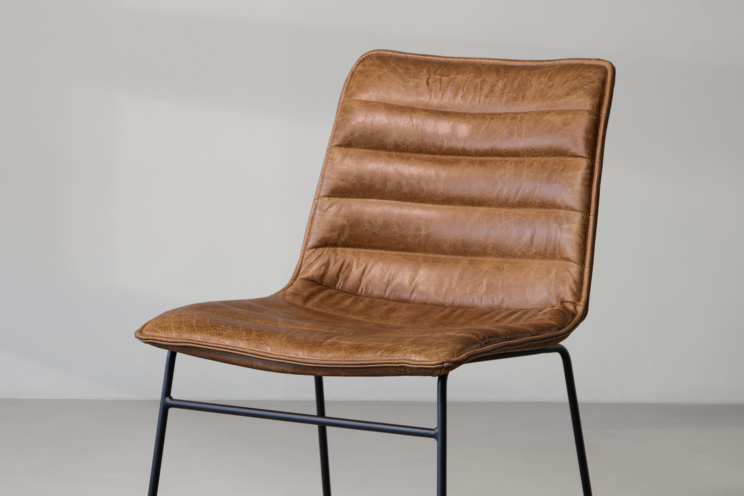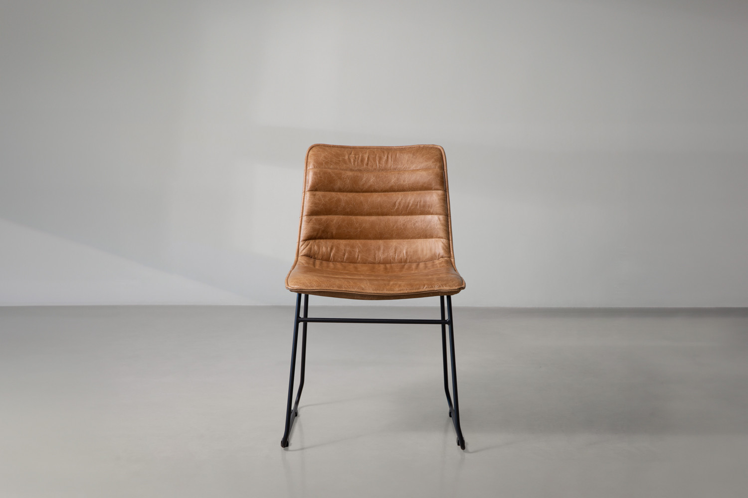 The Bennet Dining Chair welcomes an all-new contemporary dining chair with its sleek modern aesthetic and natural feel. Upholstered in full-grain leather and supported by a powder-coated steel frame. This dining chair, with its vintage style and distinctive stitching, will provide a simple yet stylish dining chair.