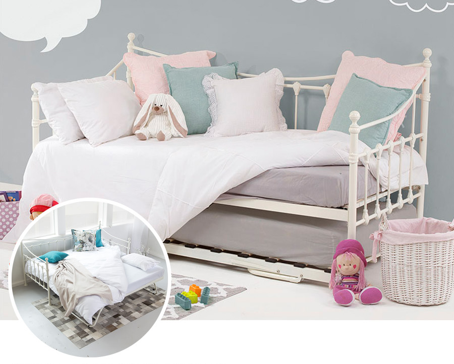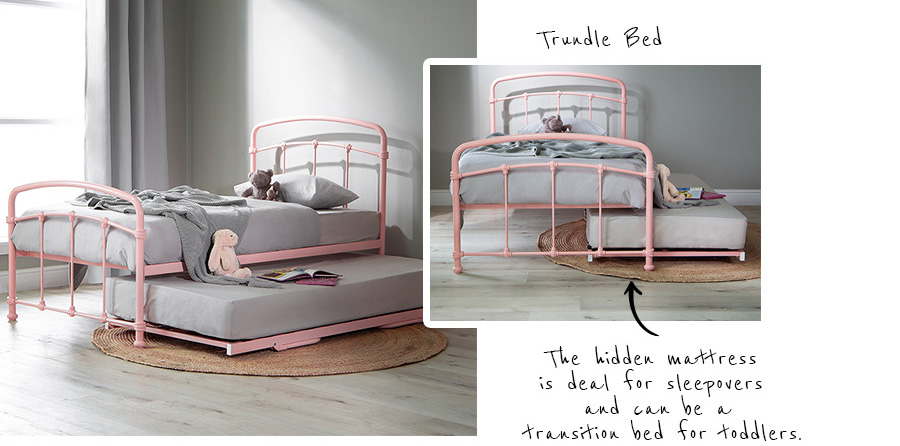 Featured Item: Larissa Bed - Blush Pink Trundle beds – always room for one moreA trundle bed may rule out one of your kids’ favorite hiding places (which is not always a bad thing), but it makes up for it by providing a sneaky extra ‘hidden’ bed which can be summoned on demand. No need to haul out the spare mattress, these convenient dual-function beds are perfect for sleepovers, and also ideal as transition beds for toddlers. Daybeds – a versatile & practical alternativeWhile not technically a category of kids’ beds, a daybed is definitely a versatile and design-friendly option to consider. The design of most daybeds provides both a comforting and protective sleeping space for younger children, which can double as a comfy couch or play area during the day. Many daybeds also offer a trundle bed or fold-out option to enlarge the sleeping space, which is a handy solution for sleepovers or difficult nights when your kids need you close. And there’s the obvious long-term advantage that you can still use it as a practical and attractive piece of furniture in your home once your kids no longer need it Featured Range: Kids Single Beds So, there you have it – a rundown of the main types of kids beds you’ll find in stores and online – though you’re sure to come across a few outliers! With all the options on the table, you may have already spotted a clear winner, or perhaps you’re now sighing with a serious case of choice paralysis. Either way, being clear on your priorities upfront will help you nail down the best option, and prevent rushing into any decisions you’ll regret.
