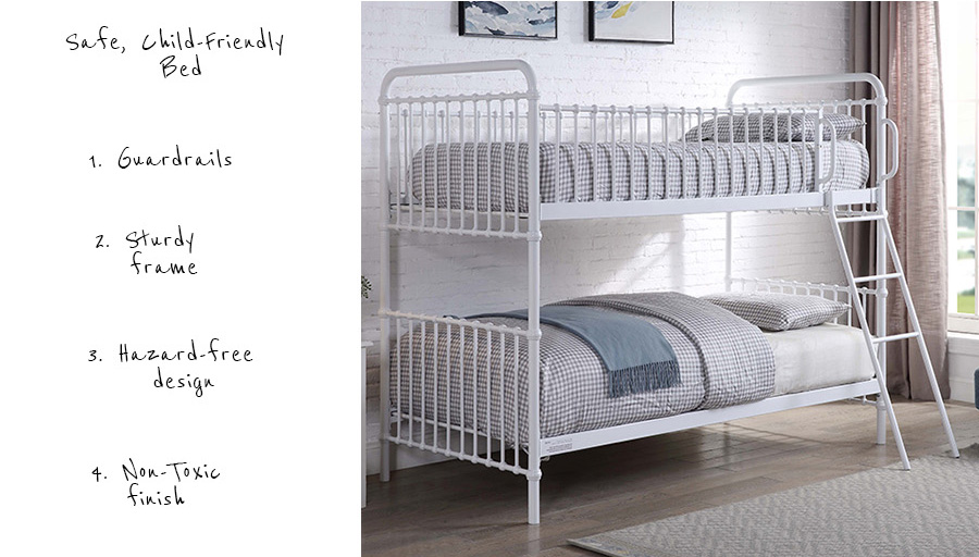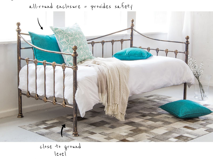 Whether you’ve got a specific question, or have no kicking clue where to start, we’ve got you covered! Types of Kids’ BedsWhen it comes to products for kids, there are always hundreds of options to choose from to make your job as a parent just that little bit more overwhelming. Gone are the days of simply choosing between a single bed, bunk bed, or shoving two siblings into a double bed! Today, if your kid can dream it, he can sleep in it (budget and space allowing, of course). To help you navigate the maze of choices out there, let’s start with a brief rundown of the main types of kids’ beds you’ll find and the concept behind each design: Featured Item: Natalia Daybed - Antique Bronze Toddler beds and Twin beds – an easier transitionA toddler bed is basically a hybrid form of a cot that keeps your kiddo close to ground level and still provides some form of all-round enclosure—most popularly disguised as some kind of house, castle, or mode of transport (supposedly designed to shoot our little ones off to dreamland). Toddler beds are designed as a gradual transition to a bigger bed. Featured Item: Amari Kid's Bed Single bed – a versatile long-term solutionIf you have the space, a standard single bed is a very practical way to go, particularly if you want to shop for a good quality bed that can last your child through to college or does the rounds with younger siblings. Plus, you can usually avoid an extended hunt for the right size bedding when your little drama queen has her heart set on her favourite Disney character duvet. Featured Item: Storage Bunk Bed Bunk beds – space-saving with a dose of adventureThe traditional bunk bed involved two beds stacked atop one another as a practical (and fun) space-saving option for kids’ rooms. Today, this basic concept has evolved into a huge number of modern variations, including triple bunks, L-shape bunks, built-in bunks, storage beds, cabin beds and novelty bunk beds (many of which are fun to Google!). Many of us grew up on bunk beds and can at least vouch for the fun factor – even if there may have been a few injuries or close calls involved. Of course, today’s health and safety standards have buckled down in a big way, so along with a much greater variety of creative bunk designs, you’ll also find they’re a lot more child-friendly (though it’s still important to check safety features for yourself, as we discuss below). You can also read more on the awesome benefits of bunk beds here. Featured Item: Meteor Study Bunk Bed - Charcoal Loft Beds – open up some floor space while your kid rises to the challengeWhile easily mistaken for a bunk bed, a loft bed is just a normal bed which is elevated off the floor—a bed on stilts, really. This has the dual benefit of giving your eager little beaver a climbing apparatus (with some extra motivation to climb into bed), as well as opening up the floor space underneath. Loft beds come in mid-level and high-level options suitable for different ages. They also come in a wide range of simple to more complex and thematic designs where the area under the bed may be designed as storage, work or play space. These may be variously referred to as cabin beds, captain beds or storage beds depending on the design and manufacturer’s branding, but they all follow the same key concept.