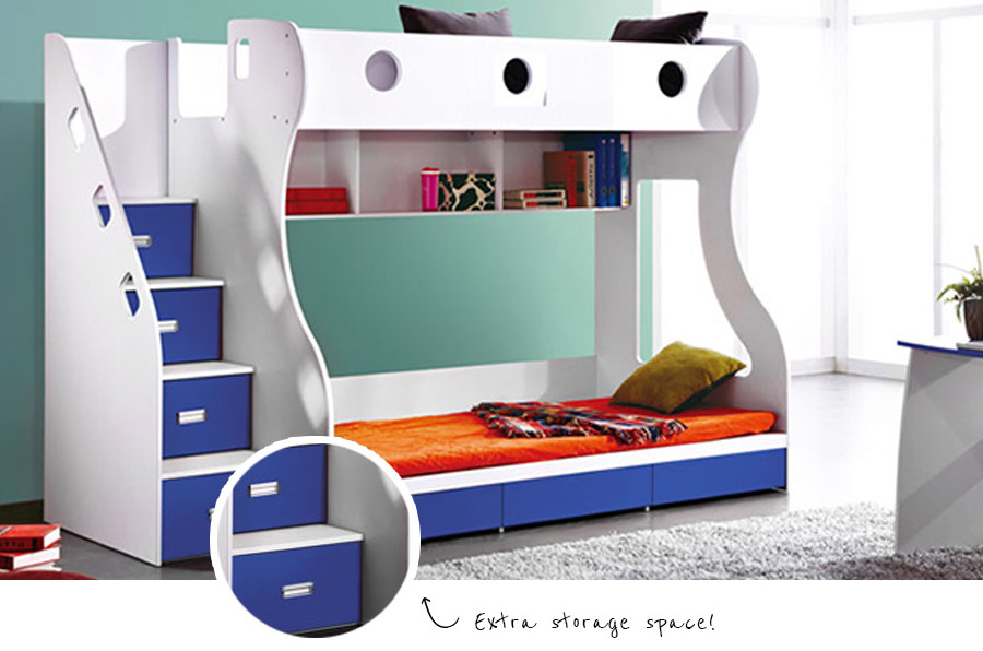 Featured Item: Storage Bunk Bed - Blue Storage beds – practical & innovativeStorage beds come in the form of single beds, bunk beds, or loft beds, but with the obvious key design feature of bonus built-in storage. From under-bed drawers and built-in shelving, to bunk bed stairs that double as cupboard space, these innovative multifunctional beds are all about space- and chaos-saving solutions for kids and parents.