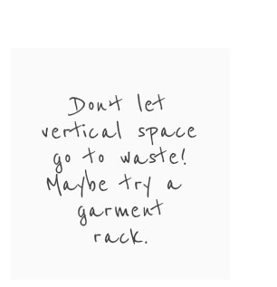 No space for a bulky closet? Go vertical with a hanging garment rack above a modest size dresser.