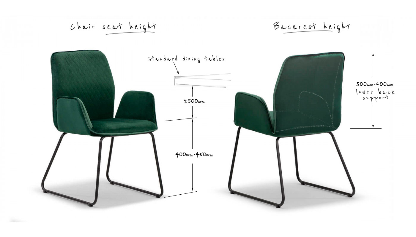 Chair seat height:To ensure a comfortable seat and eat posture, your chairs need to allow a minimum of 30cm between the seat and the table surface, and not too much more. Standard dining tables tend to be around 75cm high, which means the ideal chair should be around 45cm from the floor to the top of its seat. If your table has a wide apron, you may need to look for slightly lower seating, and if you’re going for chairs with armrests, remember to check that these will be able to comfortably slide under the table, or you’ll end up with some very frustrated eaters! Backrest height:The obvious rule here is to make sure that chair backs are at least slightly taller than the table. How much depends on personal taste and style – shorter chair backs can work well for a contemporary style, while the more classic look lends itself to a bigger height contrast. Whatever your style, a backrest should offer at least 30-40cm of lower back support.