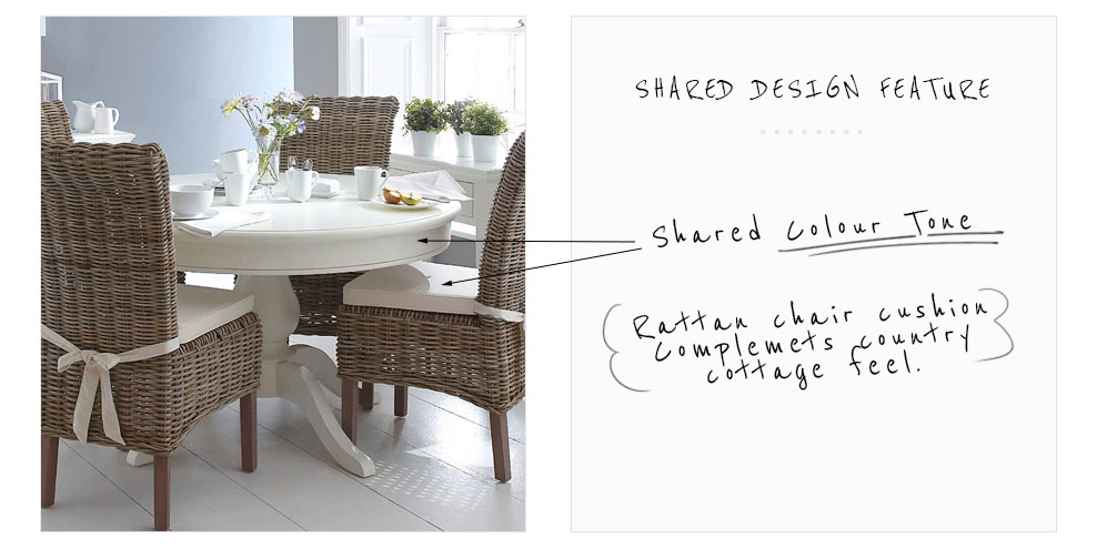 These days, you can stick to one simple principle to make a great matchup: the common element. This could be anything from a shared design feature or material, to a colour tone or highlight, to the general period or level of formality. For example, the rattan chair set below pairs its cushion colour and country cottage feel with those of the wooden table, while the chairs pictured right match their legs with the tone and tubular shape of the table, while smooth plastic seats harmonize the contemporary look of the dining area overall.