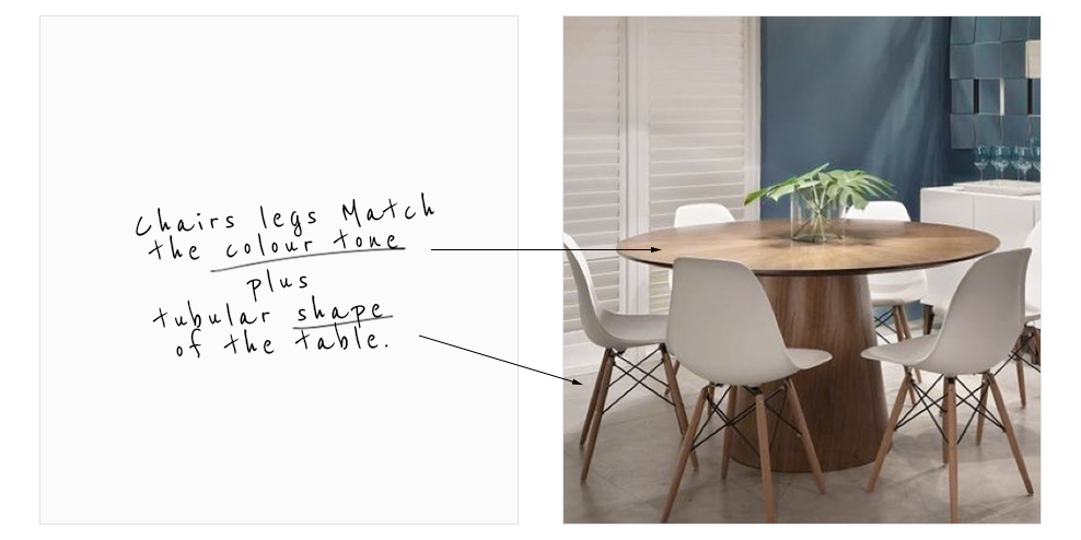 Chair width:For starters, you want a dining chair that has at least 40-45cm seating width – you don’t want your guests falling off their chairs unless it’s with laughter at your brilliant wit or amazement at your exquisite cuisine. Secondly, you should allow about 60cm breathing room between chair seats (excluding armrests) to avoid diners elbowing each other and suffering too much garlic breath. You’ll have to do the real math on this depending on the size of your table and the desired number of garlic-grabbers. Chair Depth:When choosing your dining room chairs, style should never trump comfort. Chair depth is key to good posture, good circulation, and good eating. So, to keep all bodies happy, pick chairs that are at least 50-60cm deep. Seek the common elementWith the boring math out the way, you can venture on to the more exciting part of your quest: the great chair and table romance.