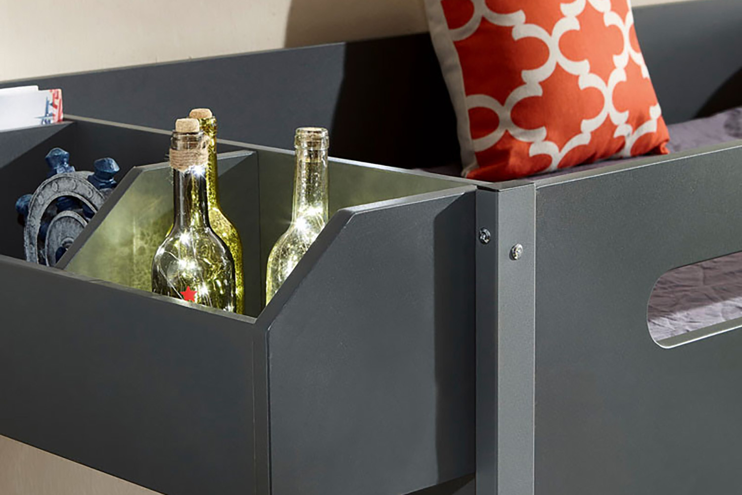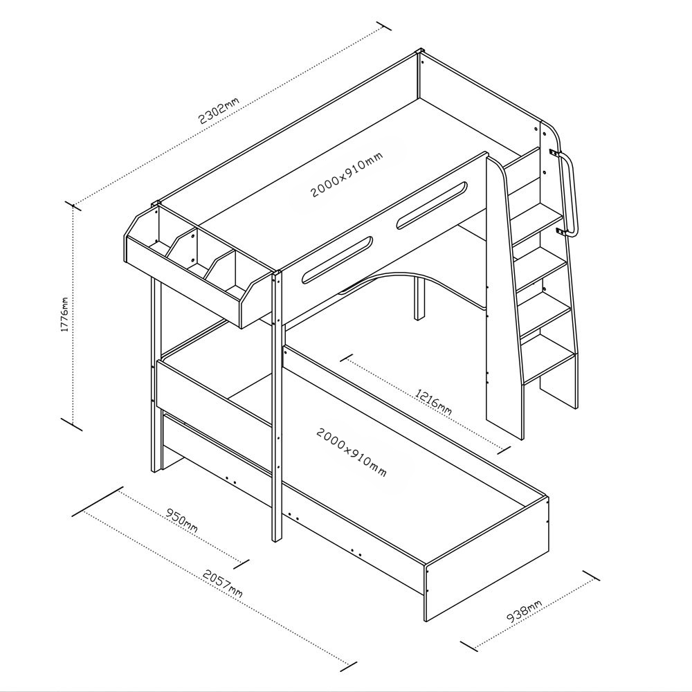 The top bunk is fun and safe for younger siblings or sleepovers, and can be used for extra storage if not being used as a second bed. The innovative design provides plenty of additional storage options with a top box shelf, desk space, and ladder which can also function as a stylish and handy bookshelf.