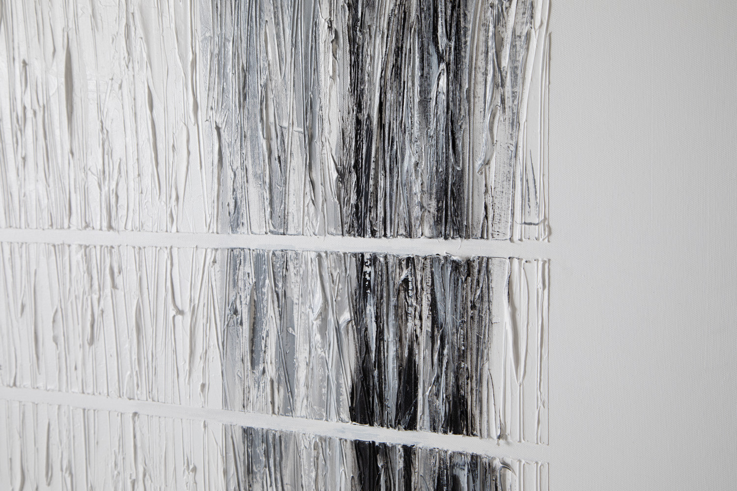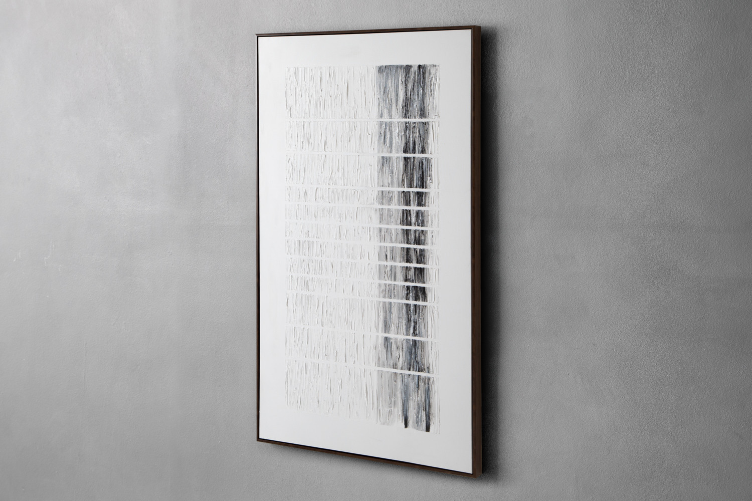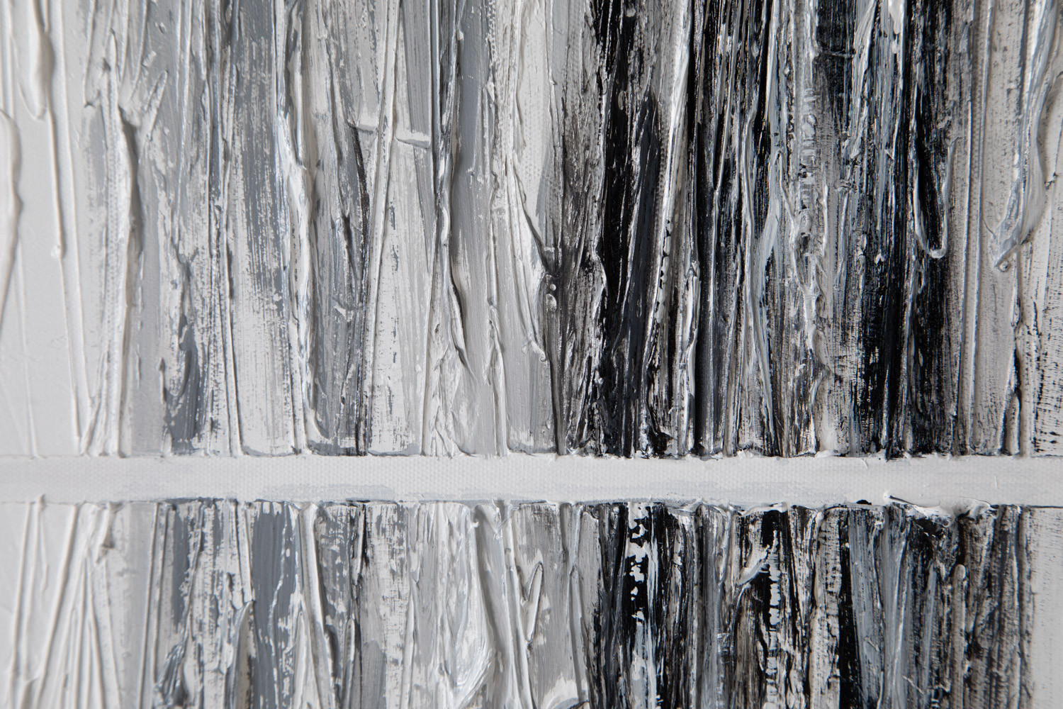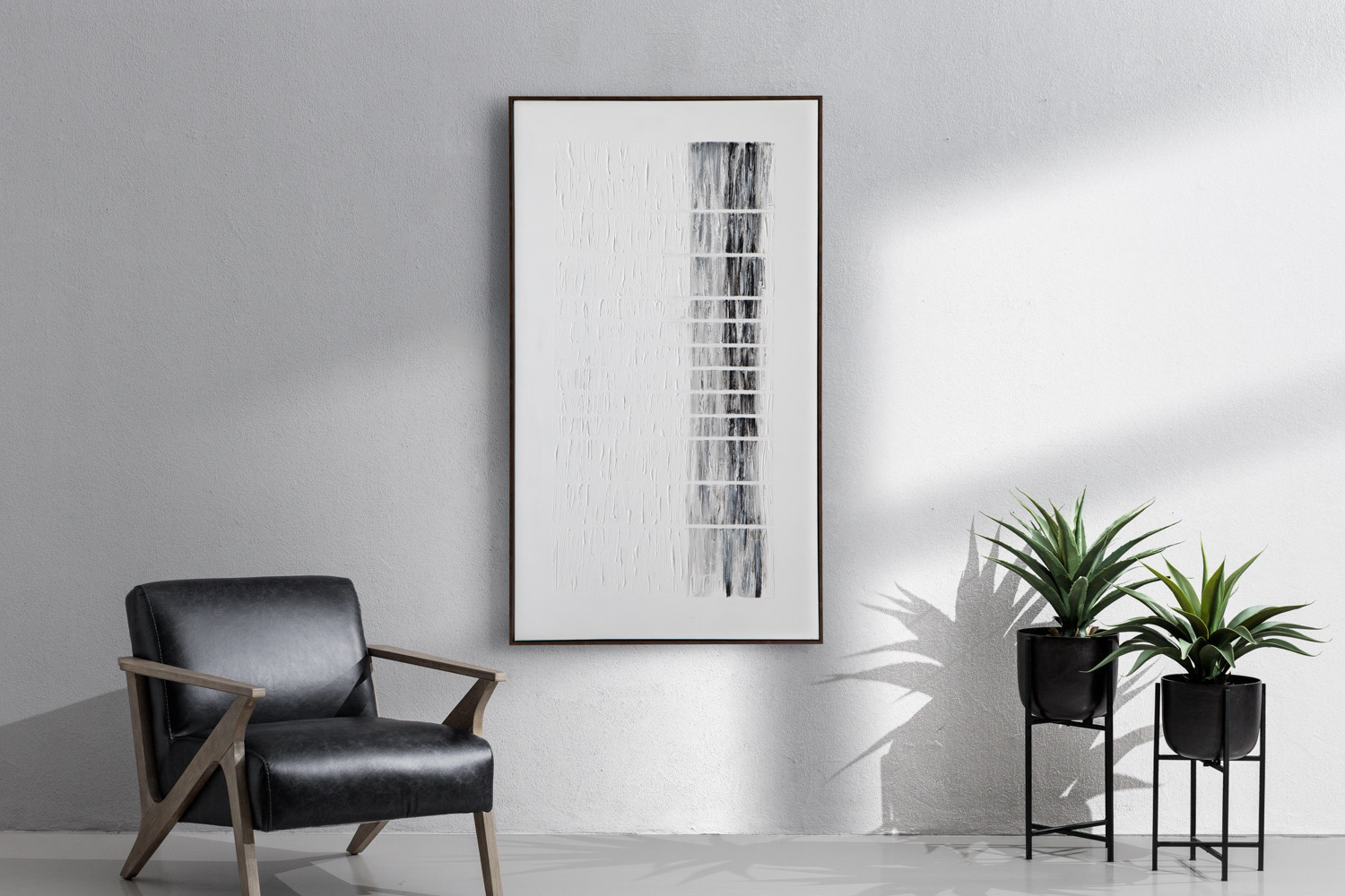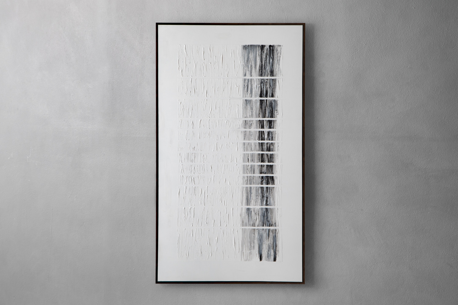 The Ember shines in contemporary interiors with its restrained monochrome palette and richly textured brushwork. The vertical banding and subtle grid give it structure, while raised paintwork catches natural light to add movement throughout the day. This artwork pairs effortlessly with modern décor, adding texture and depth along the way.