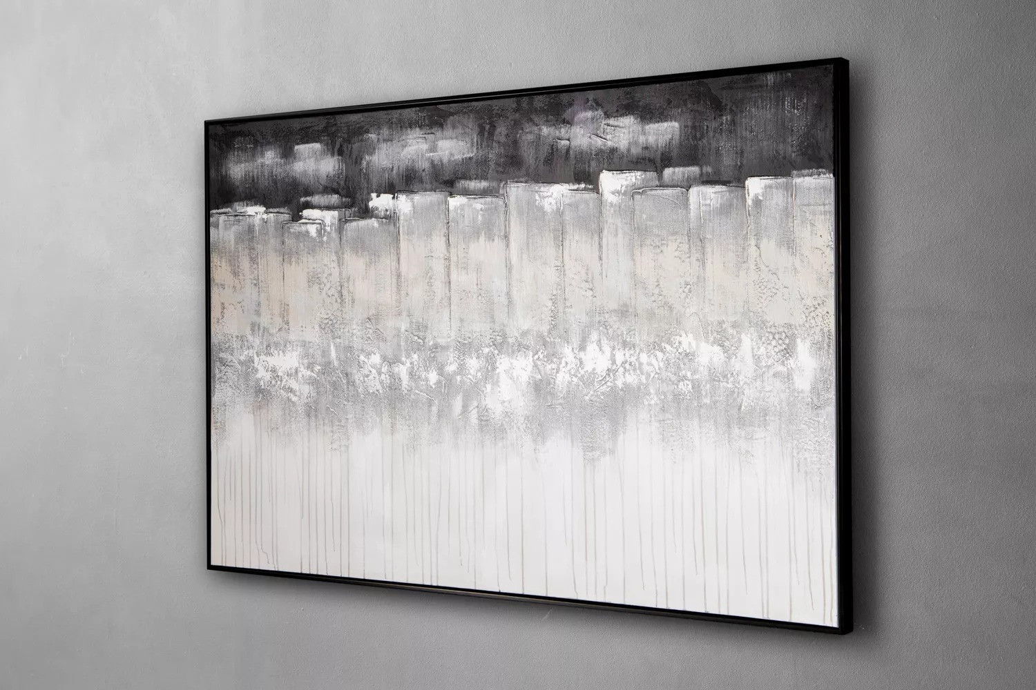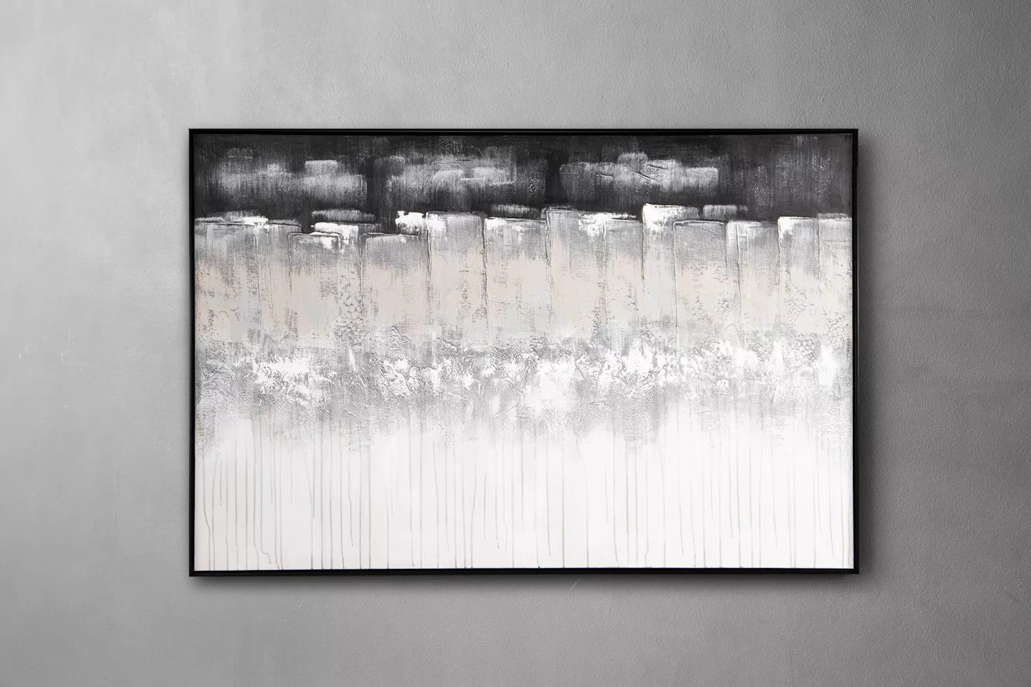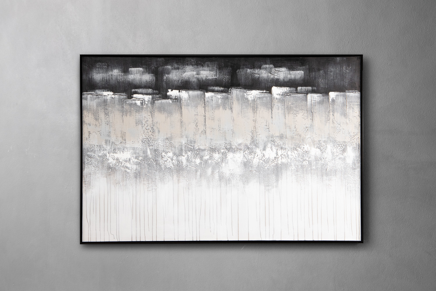 The Glacier is a striking, modern statement piece, designed to add bold elegance to any room. Featuring deep, layered strokes in sophisticated grey tones, this art piece's contrast captivates while complementing various decor styles. Housed in a minimalist black floating frame, it brings a bold aesthetic with tactile depth, inviting viewers to explore its textured composition.