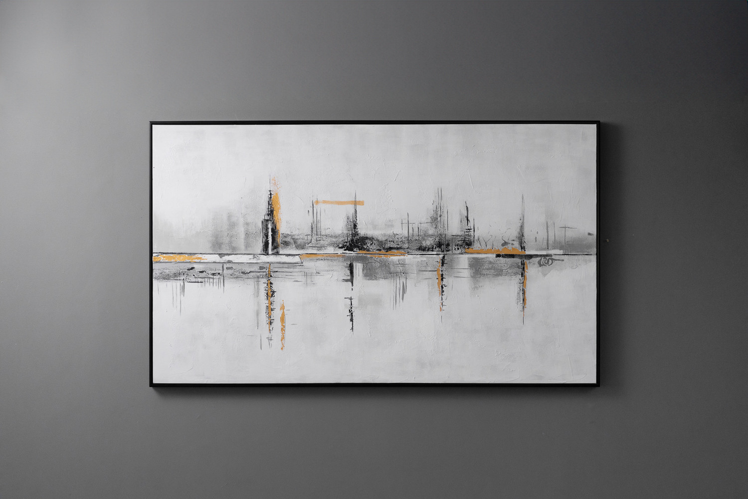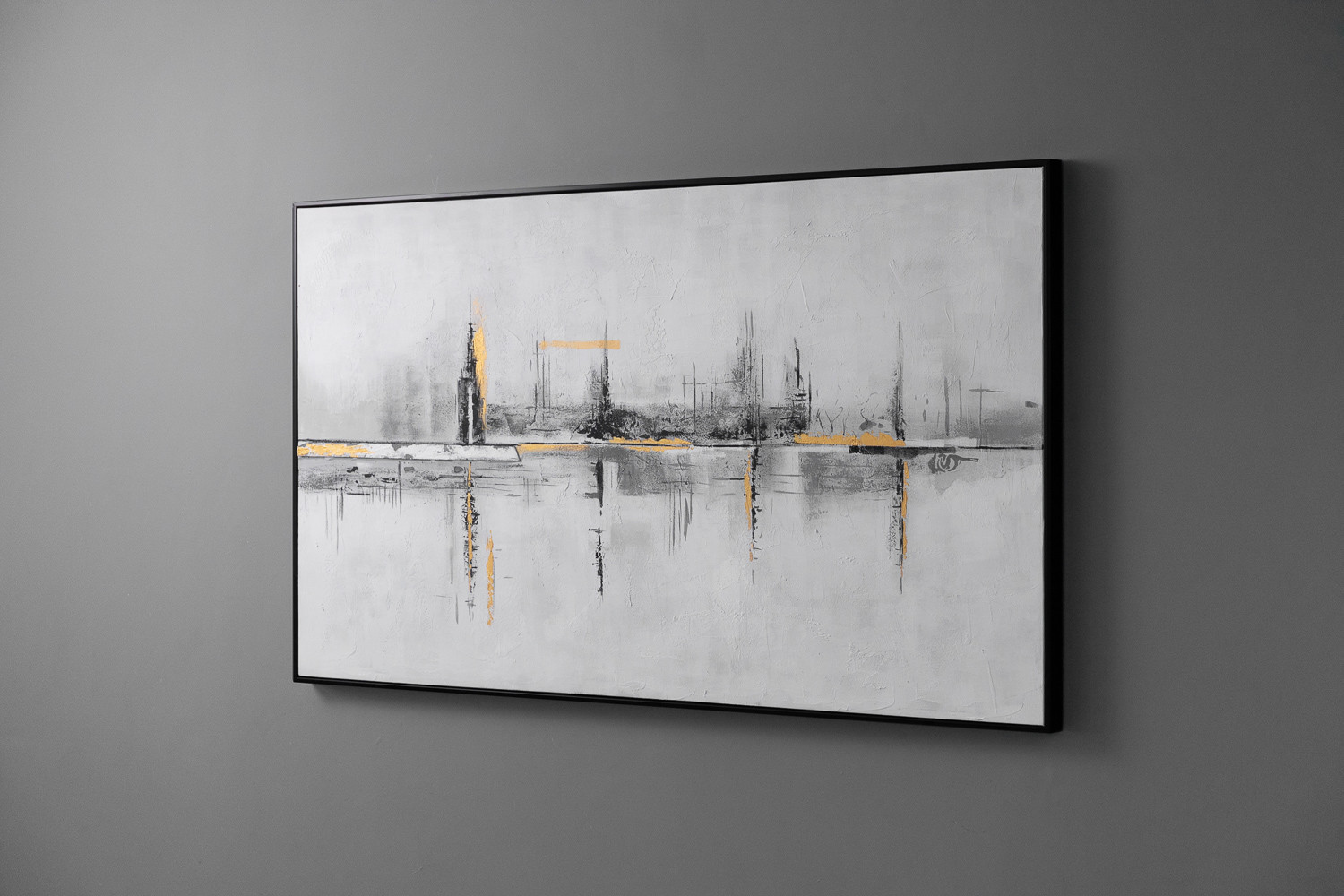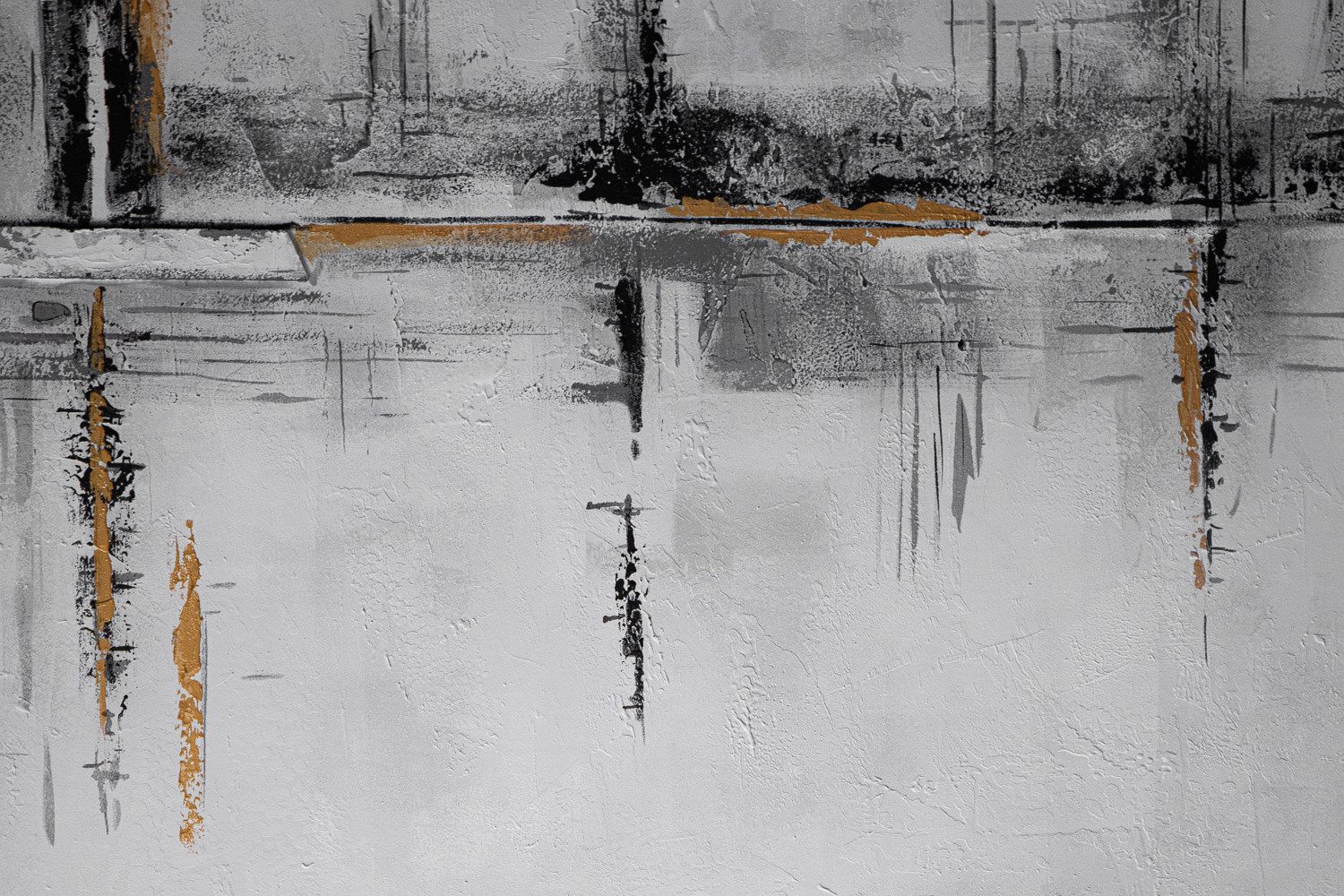 The Oswin is an eye-catching piece of contemporary canvas art. This hand-painted design captures a serene, abstract setting of monochromatic tones with vibrant gold accents. This exquisite canvas embodies tastefulness, elevating any space with its timeless appeal and dynamic textures.