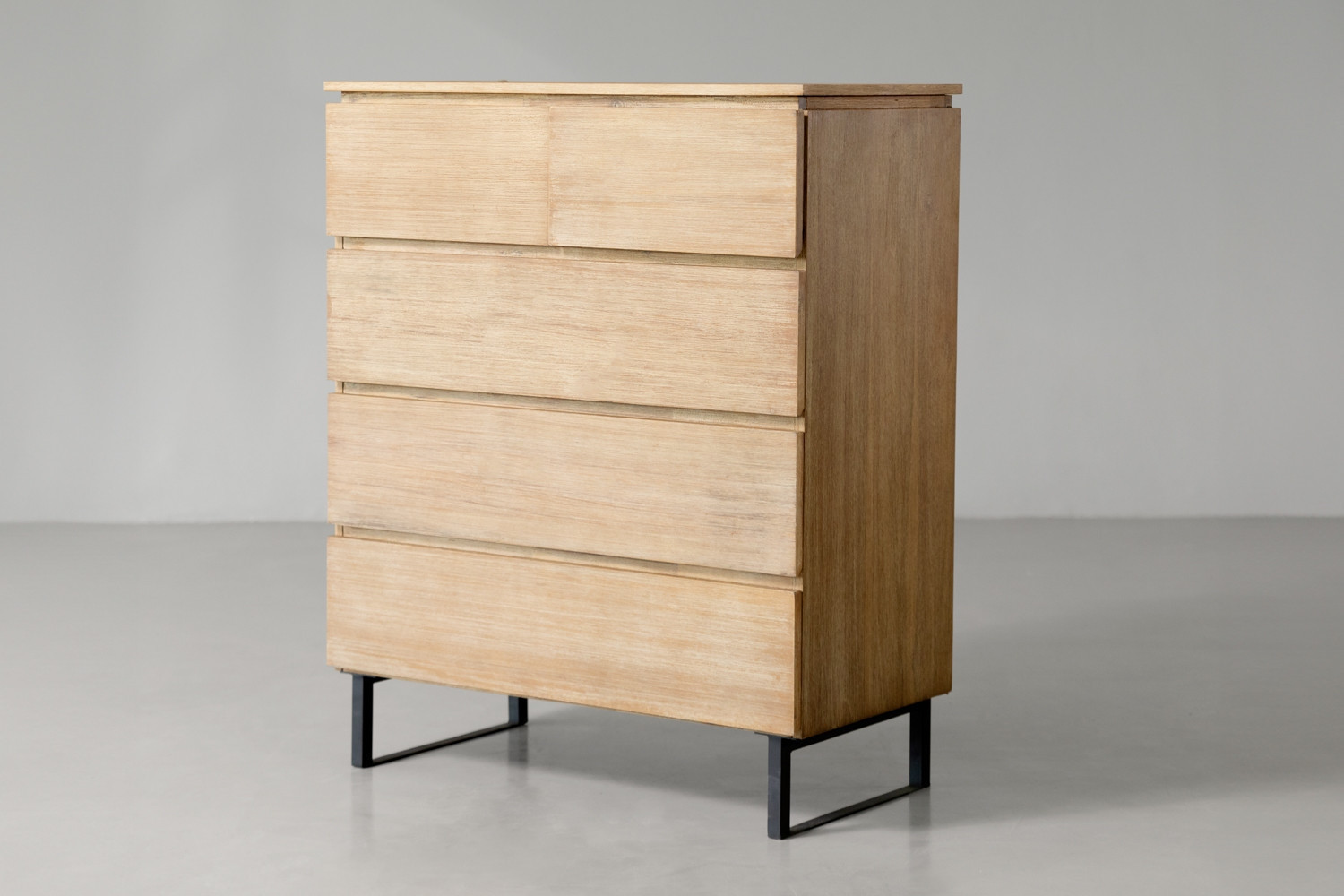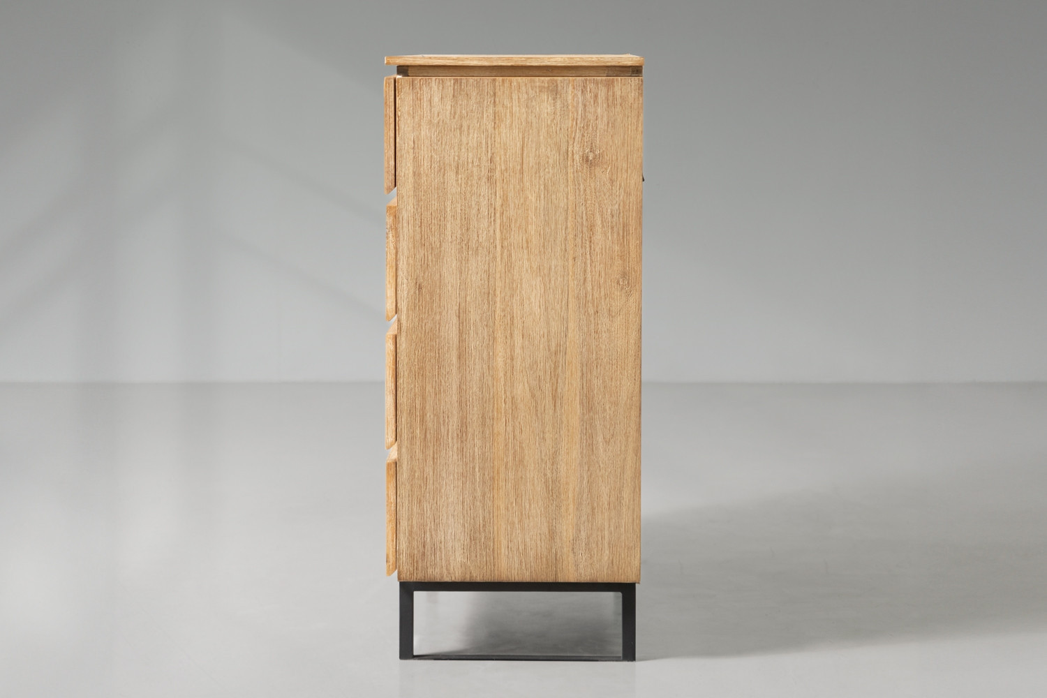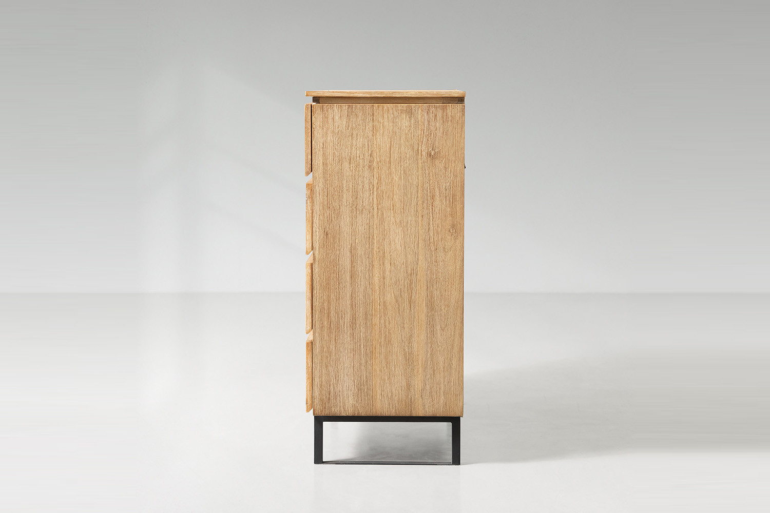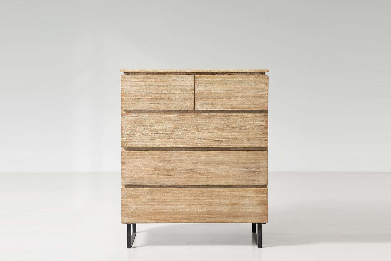 The Catalan Chest of Drawers embodies contemporary class. This five drawer chest of drawers combines wire brushed Acacia wood and powder coated steel legs to present a warm yet modern bedroom piece.