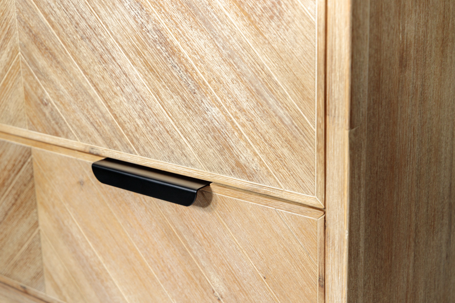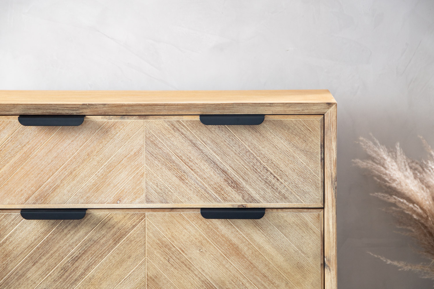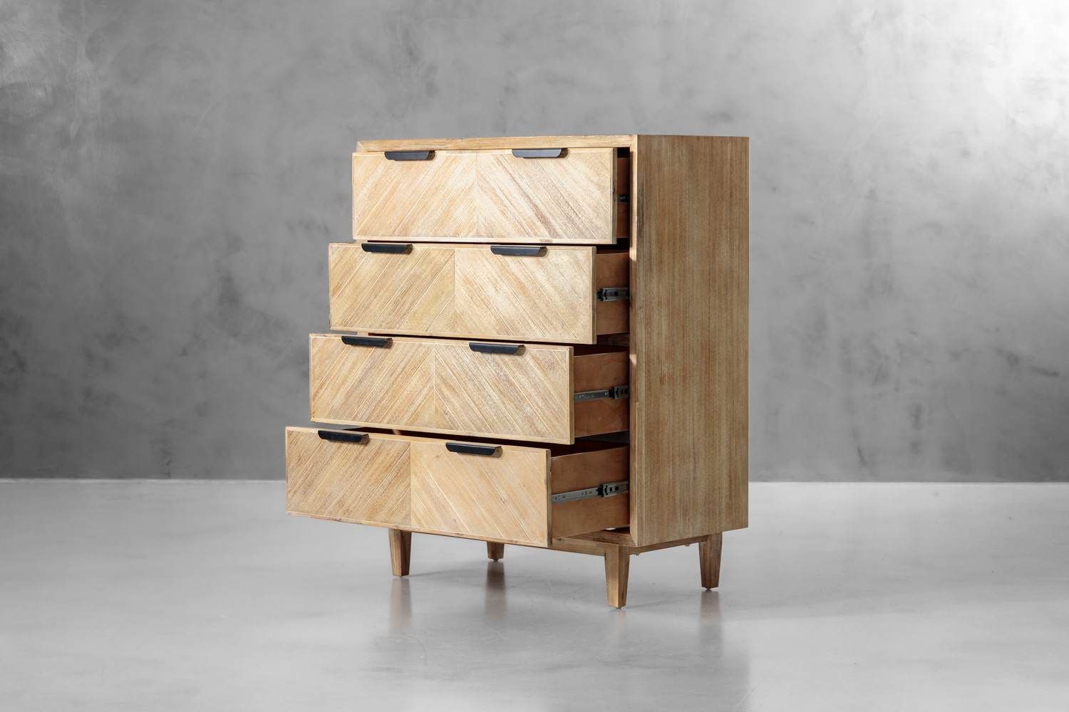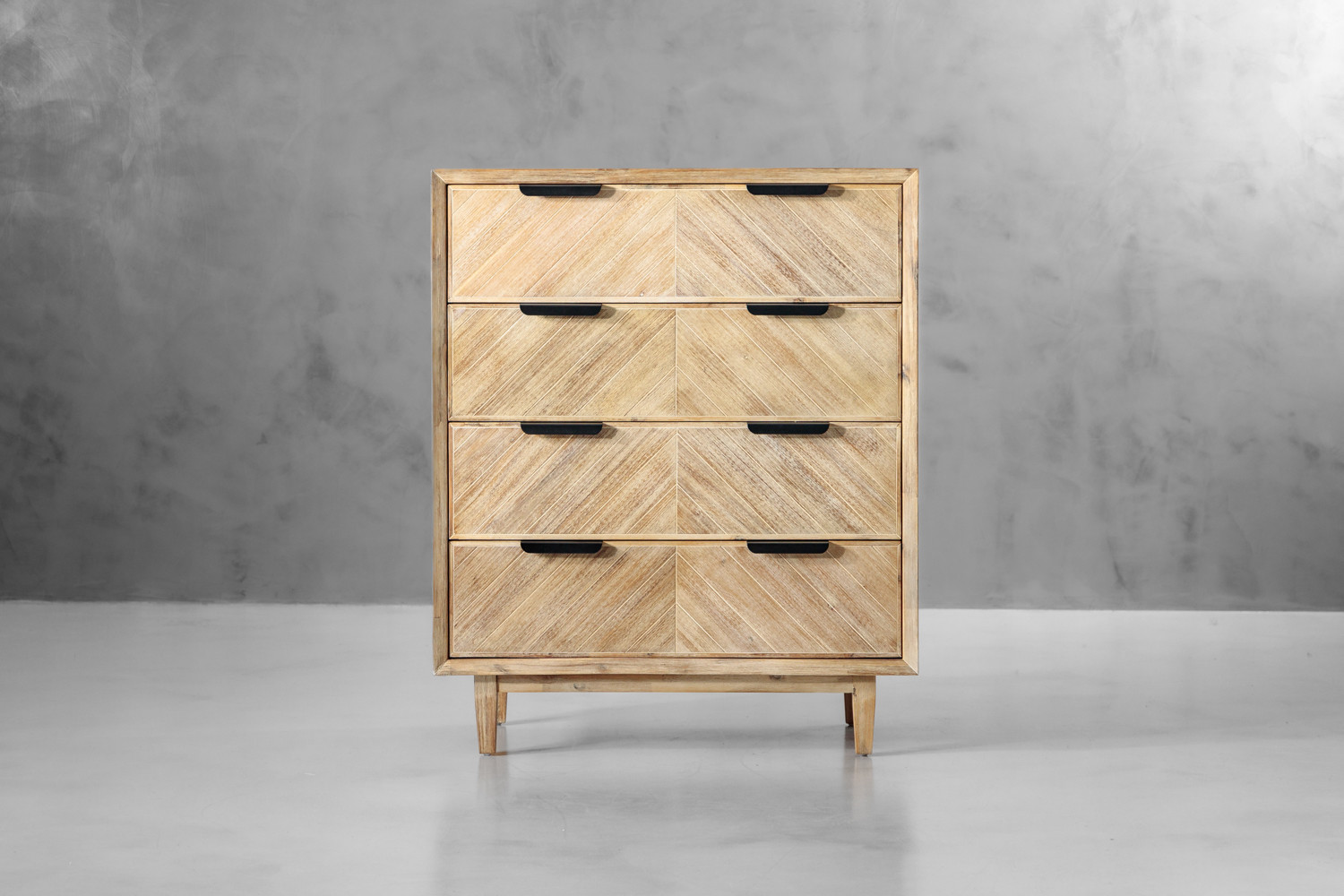 The McKenna Chest of Drawers infuses your space with the harmony of Acacia wood and contrasting black metal handles. Four spacious drawers provide ample bedroom storage while the chevron pattern and brushed Acacia wood embodies Scandinavian style, bringing beauty and function to your space.