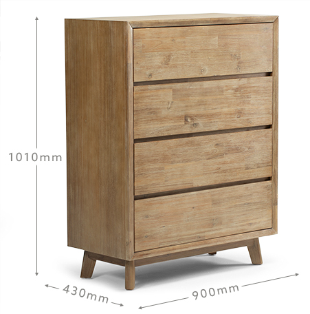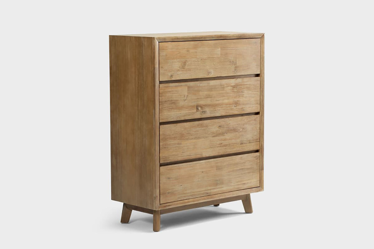 The Peyton 4-Drawer Chest of Drawers focuses on simple beauty and expert craftsmanship, offering a sleek contemporary design with ample storage space. The Chest of Drawers is constructed from high-quality solid Acacia wood – a dense hardwood with exceptional durability – and covered with Acacia wood veneers that provide a superior aesthetic and protect the wood from expanding or splitting due to temperature variance, ensuring it will last for decades. The wire brush technique beautifully enhances the unique grain of this wood and gives it a slightly weathered finish that will hide any accidental scratches (although Acacia is already naturally scratch-resistant).