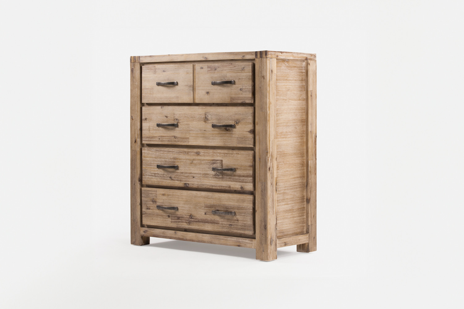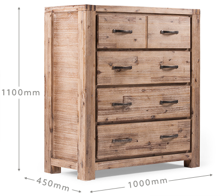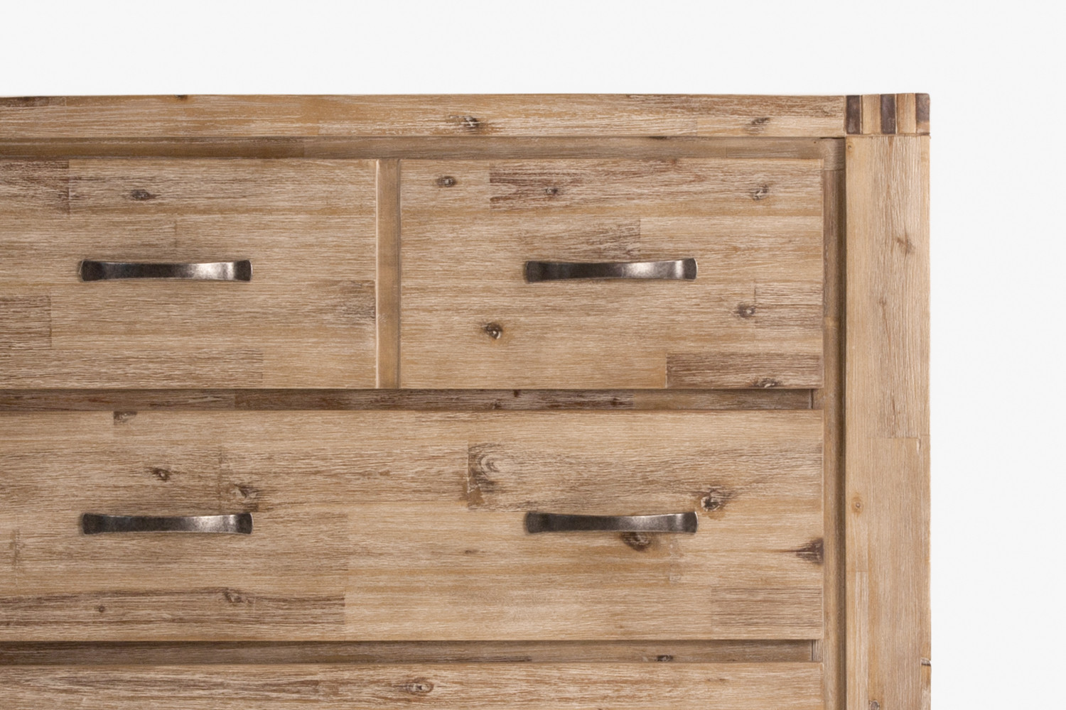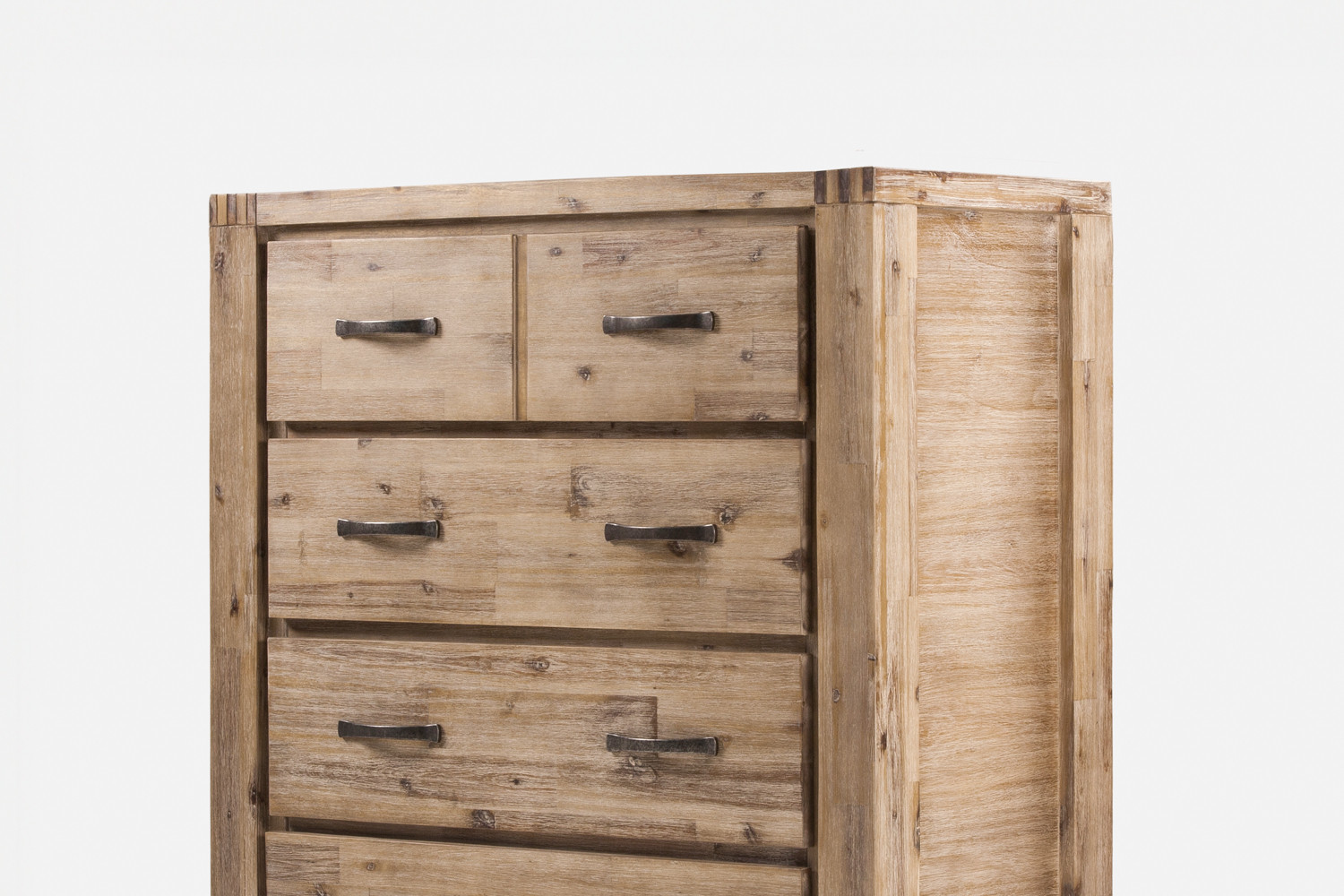 The chest of drawers is constructed from solid Acacia wood – a dense hardwood with exceptional durability – and covered with Acacia wood veneers that provide a superior aesthetic and protect the wood from expanding or splitting due to temperature variance - ensuring it’ll last you for decades. The wire brush technique works beautifully to bring out the unique grain of this wood, while giving it a slightly weathered look that will hide any accidental scratches.