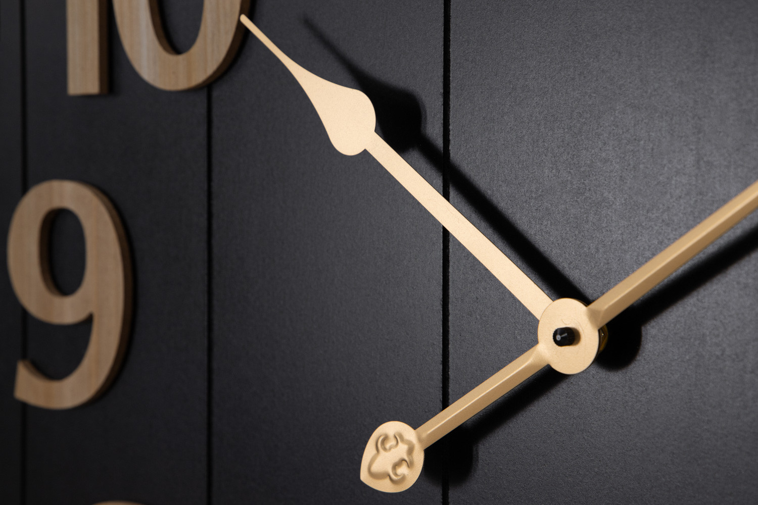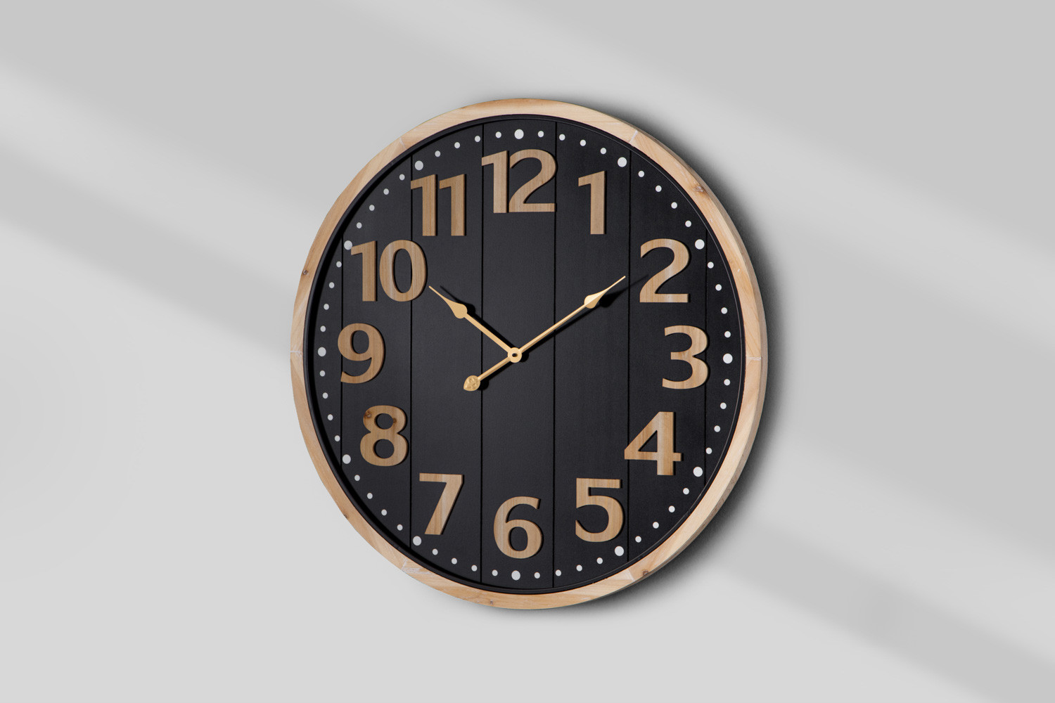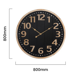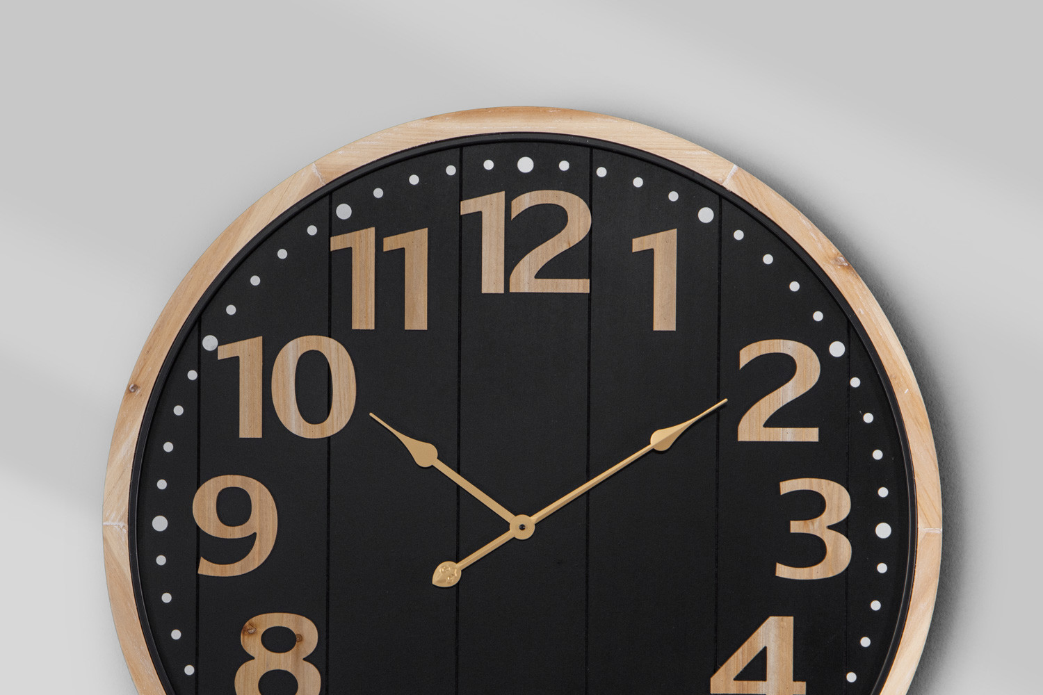 Its sleek brass-coloured iron clock hands create a polished, elegant look, while the bold contemporary numerals are designed for easy readability from any distance. The combination of the black backdrop and natural wood detailing gives the clock a unique visual appeal, making it an ideal choice for both modern and industrial-inspired interiors.