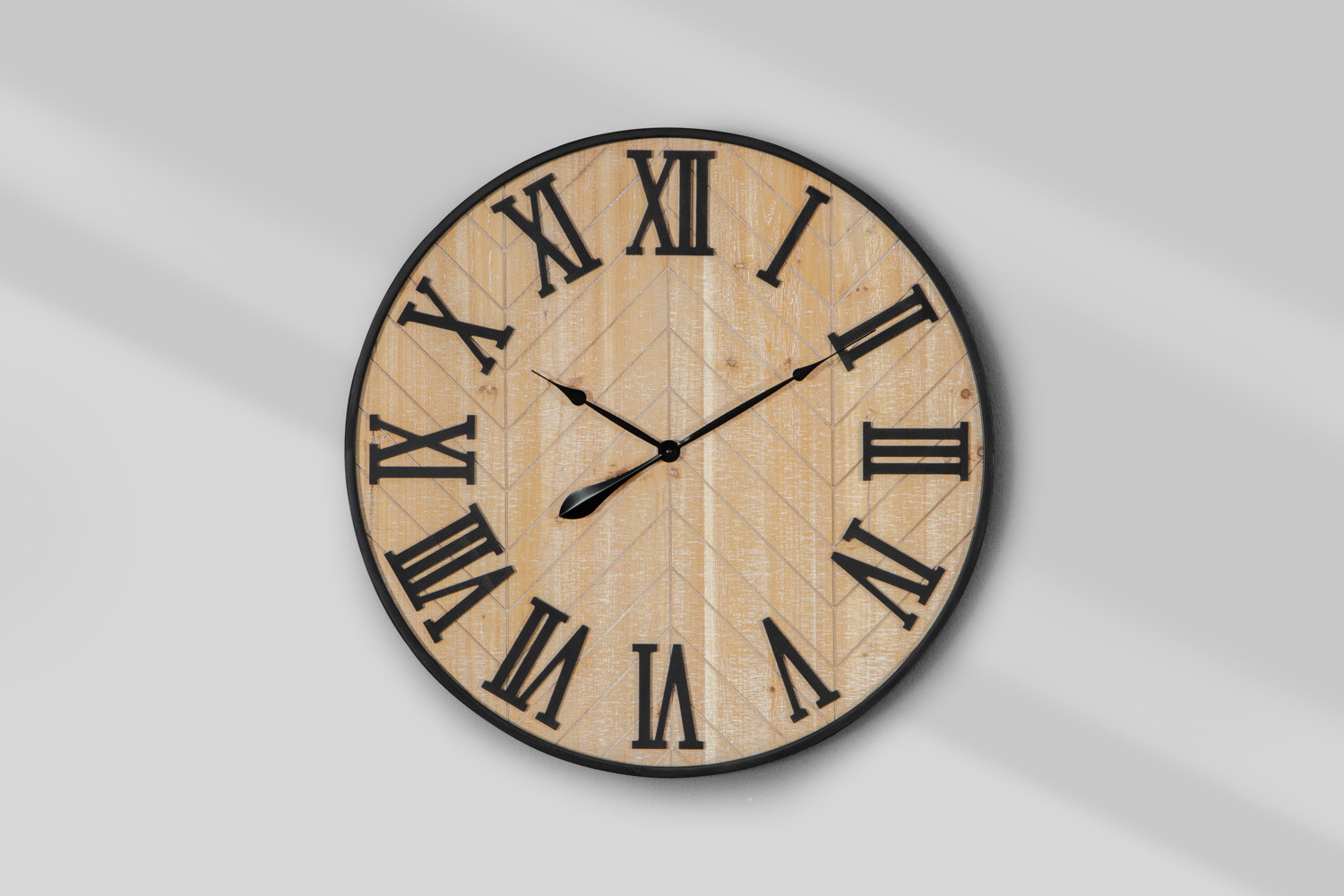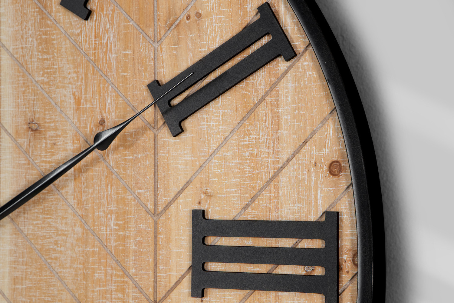 The bold Roman numerals add a sense of timeless elegance, giving the Nevaeh Wall Clock a classic touch that draws the eye without overwhelming the room. These striking numerals are complemented by sleek black iron clock hands, which stand out beautifully against the wooden backdrop. The contrast between the wood and iron creates a harmonious blend of rustic and modern elements, making the clock an ideal addition to various decor styles.