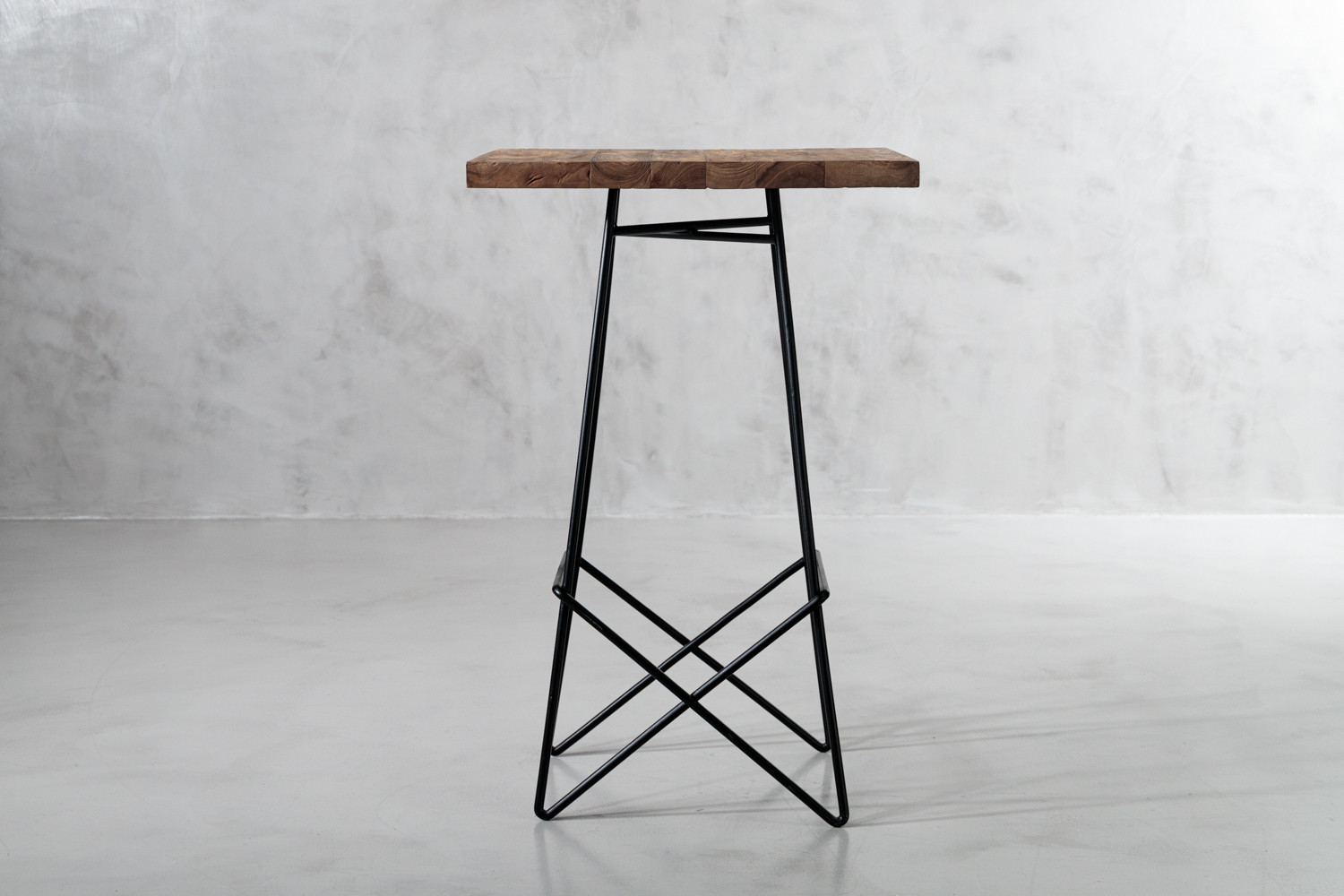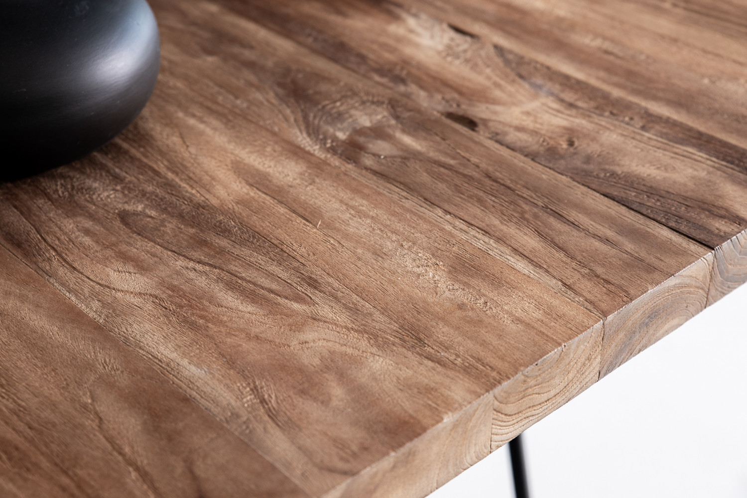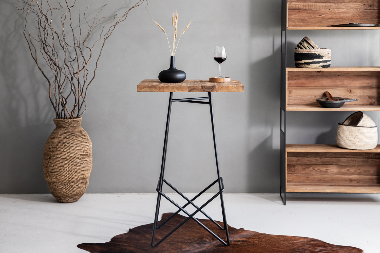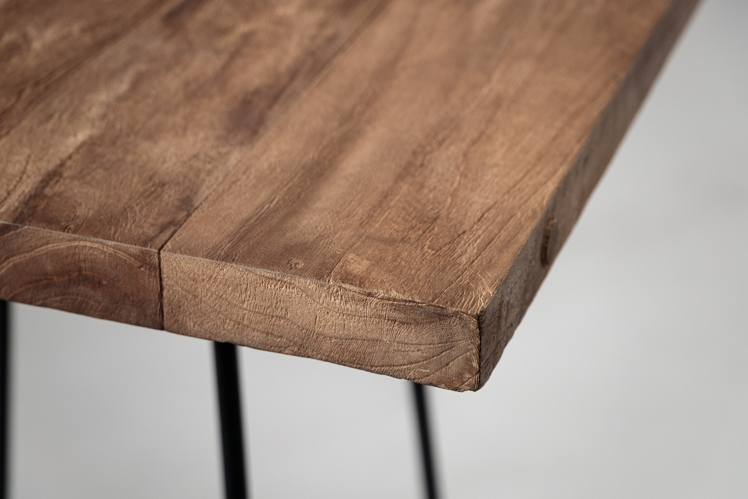 Contemporary industrial mix cocktail table featuring an abstract metal frame and wooden teak top.