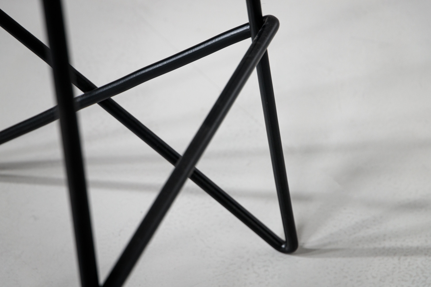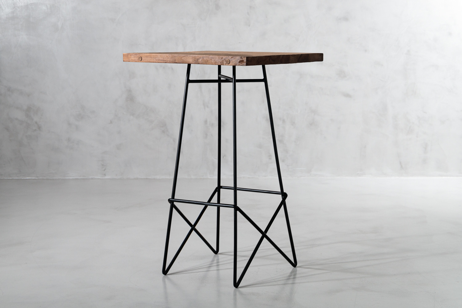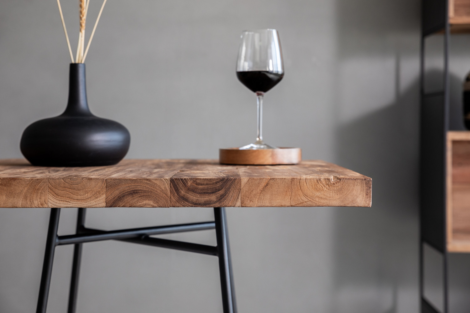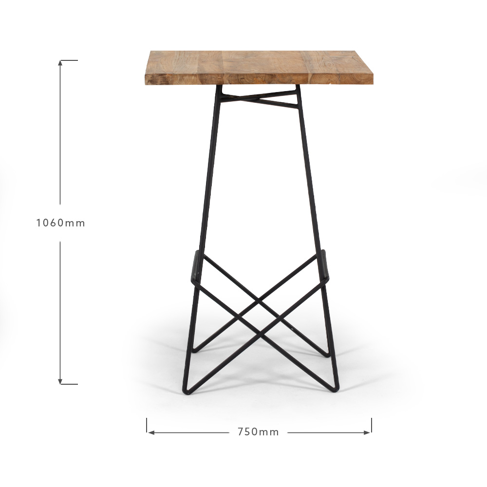 Contemporary industrial mix cocktail table featuring an abstract metal frame and wooden teak top.