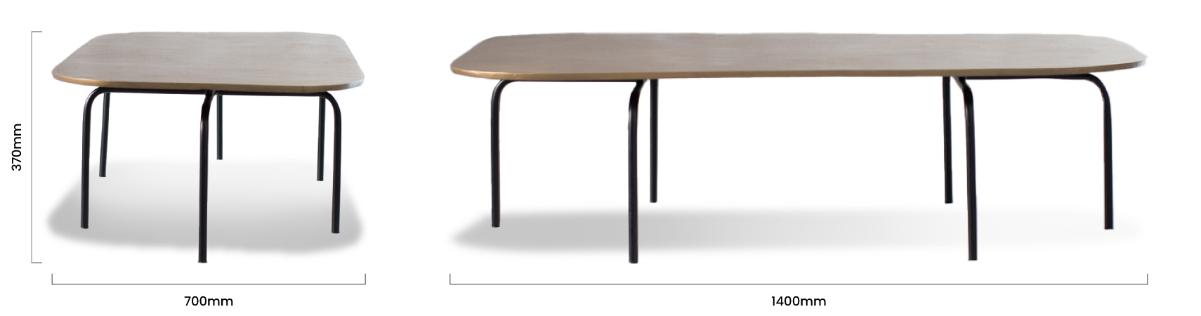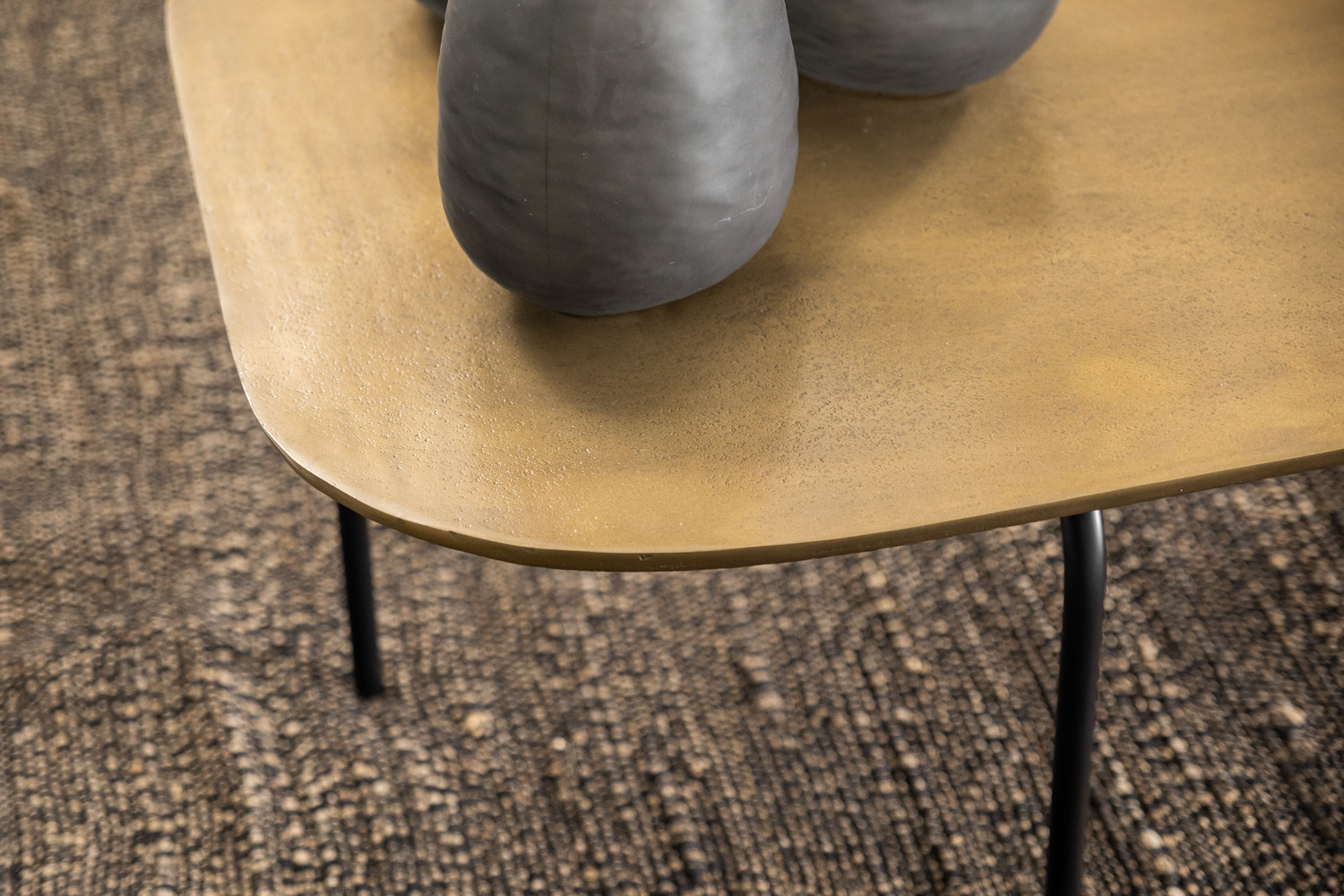 The Araria Coffee Table introduces a contemporary accent piece to any living space. This modern coffee table boasts an aluminium top with mild steel legs, presenting a stylish and durable addition.