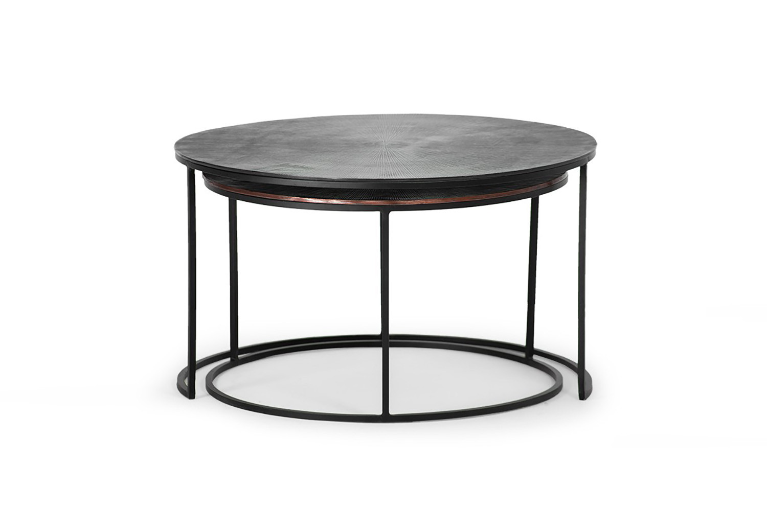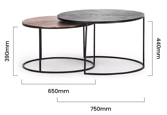 Fill any space with charm and character with the Dinesh Nesting Coffee Table Set. This elegant two-piece fits perfectly together, both literally and figuratively, with tops made from aluminium nestled on sturdy iron frames.