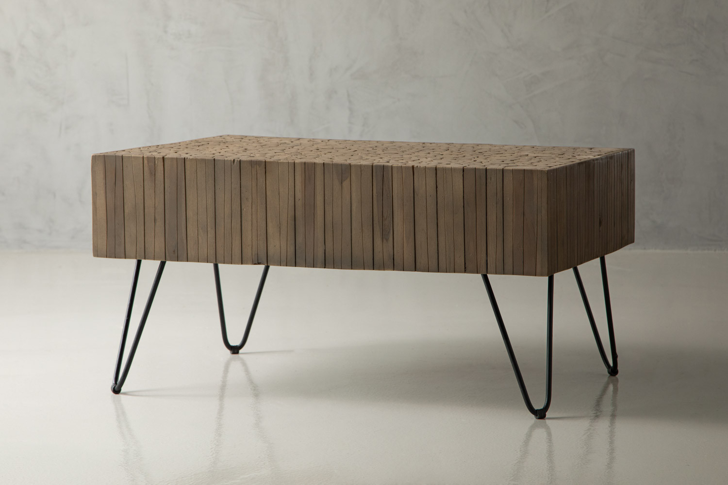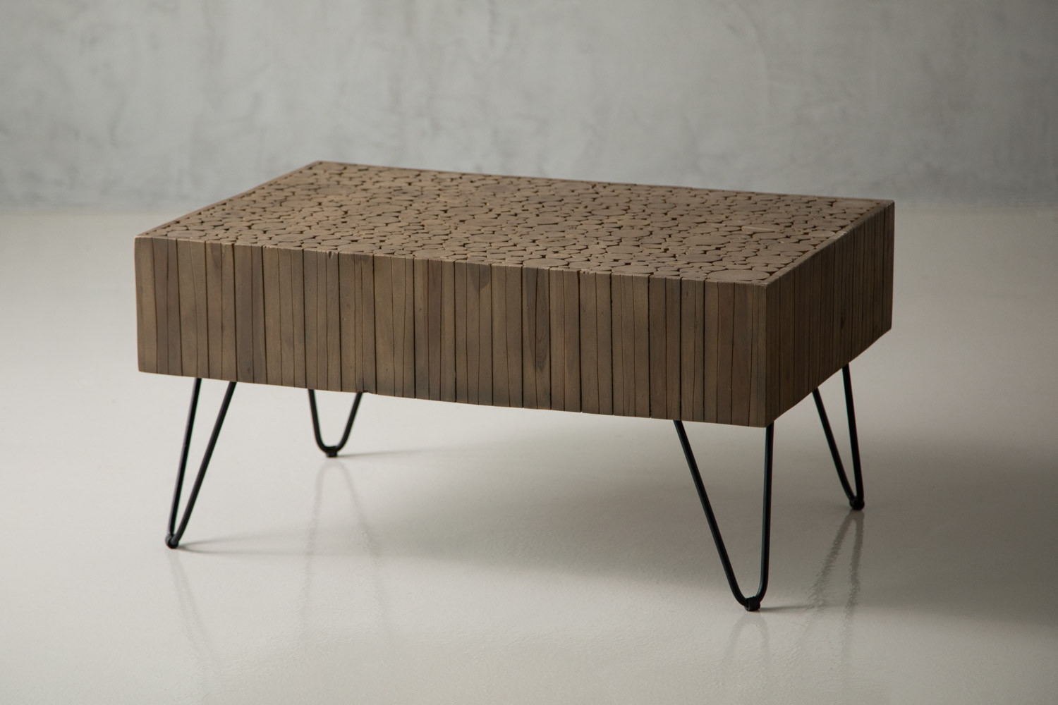 The Gaylin coffee table is crafted from teak wooden rounds with hairpin legs. Impressive in any setting.