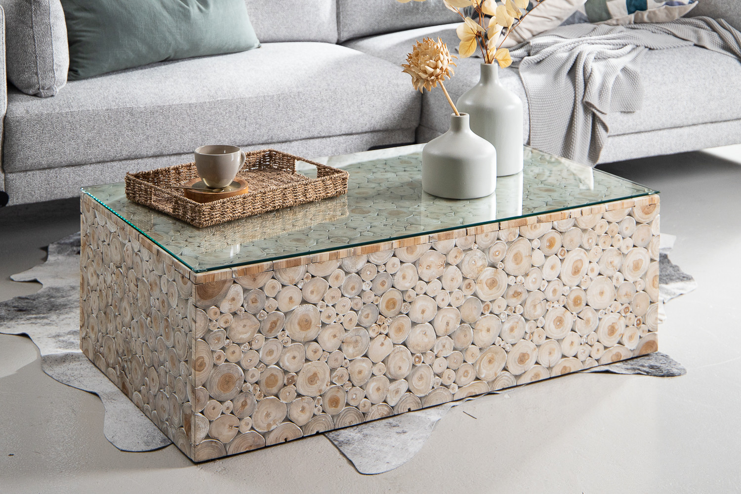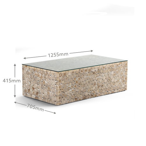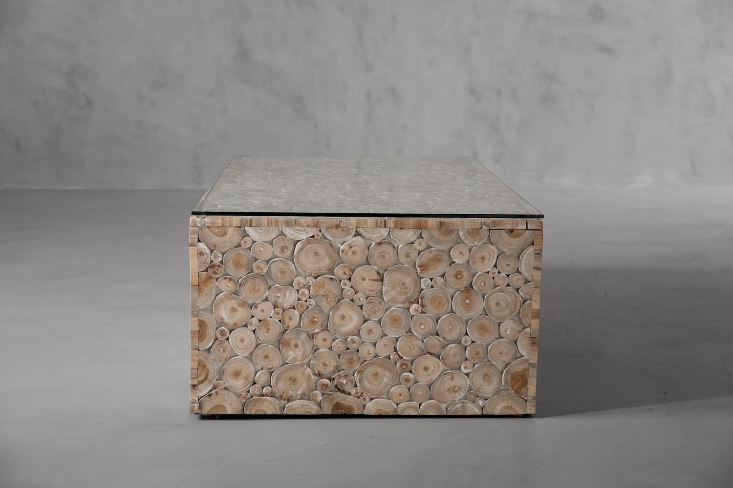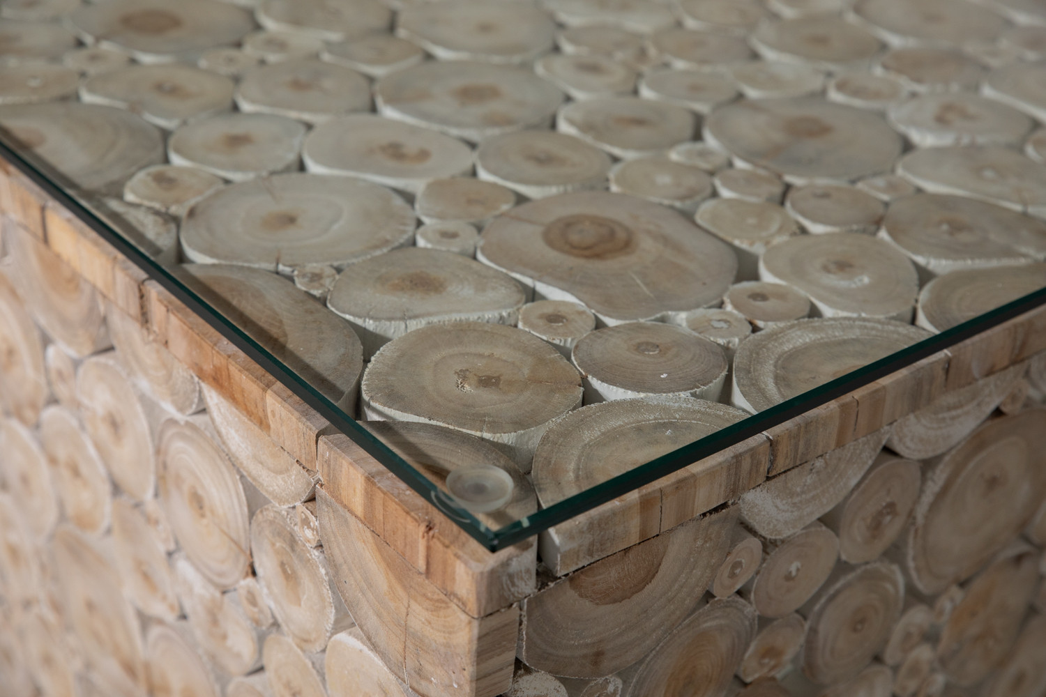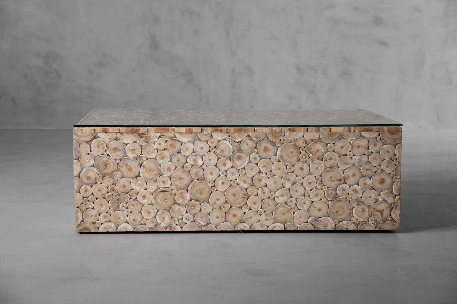 Inspired by nature with a sleek modern edge, the Jabari Coffee Table offers a distinctive statement piece, adding creative inspiration to your living space. Expertly crafted from Teakwood rounds sculpted into a solid shape and finished with a tempered glass top, each Jabari Coffee Table is a one-of-a-kind, guaranteed to be an impressive and unique focal point in any setting.