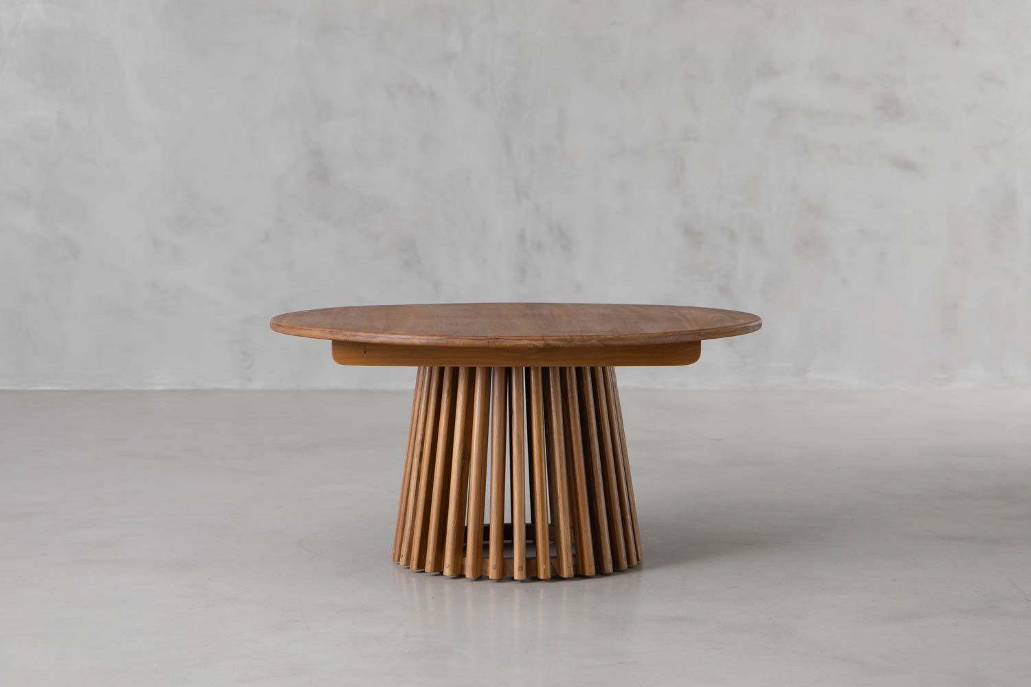 The Tonga coffee table exudes a mid-century modern aesthetic with its clean lines and warm wood tones, making it a timeless piece for contemporary living spaces. This solid wood coffee table features a circular Teak wood top with a smooth finish, resting on a striking base composed of rounded teak wood slats. This charming coffee table compliments a variety of interior styles.