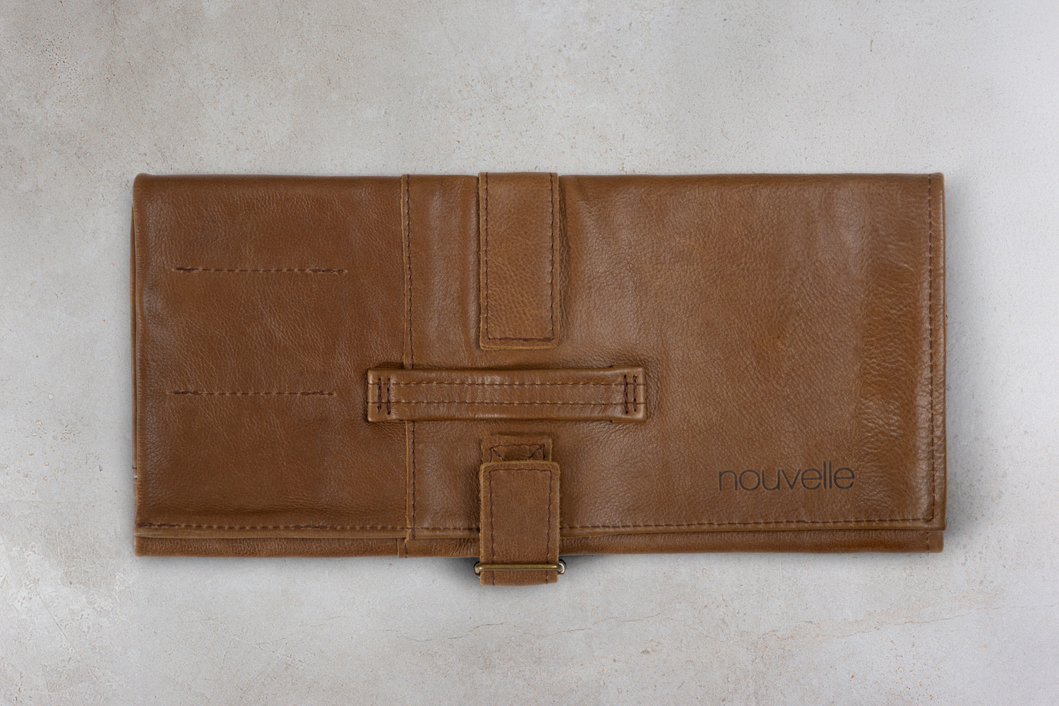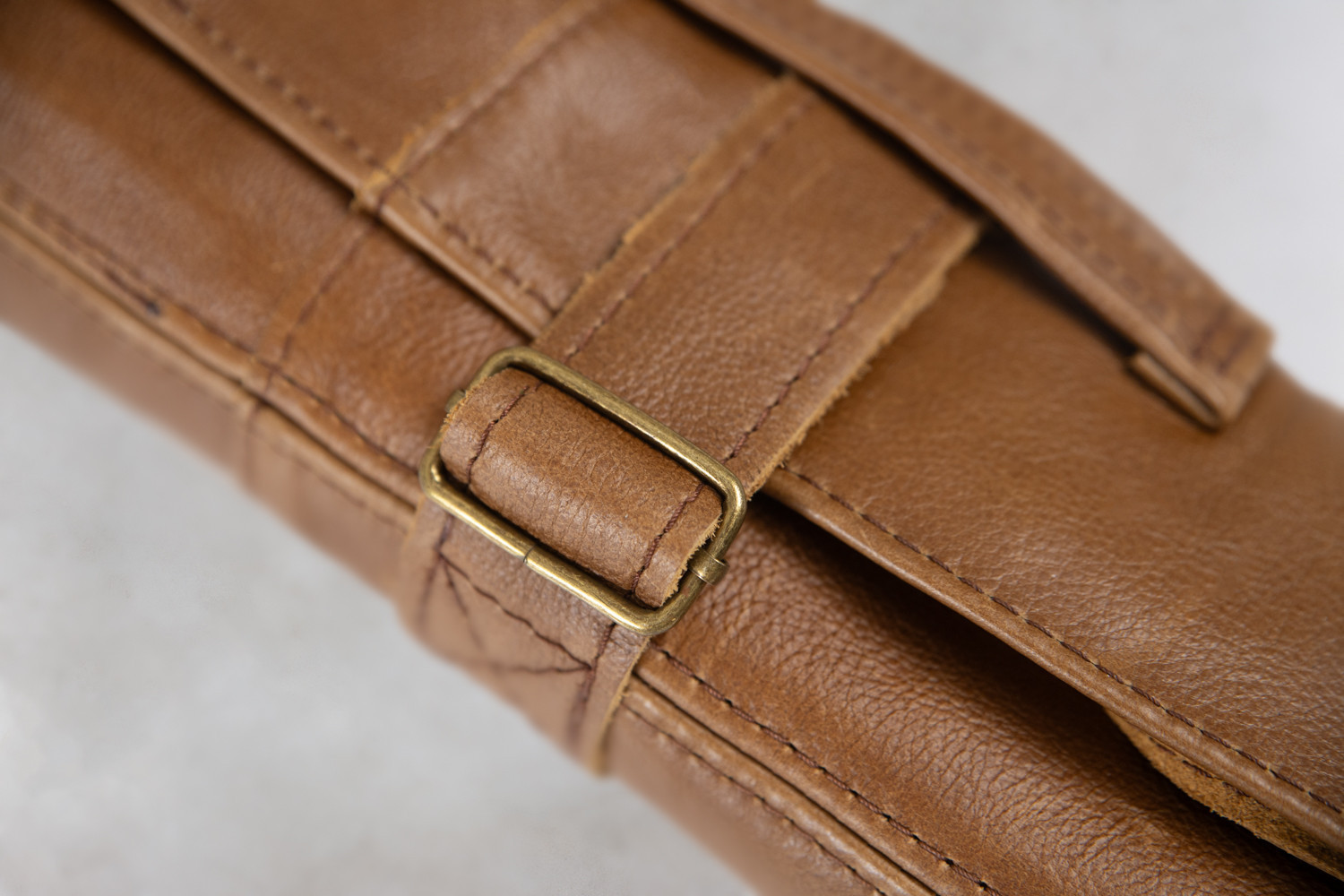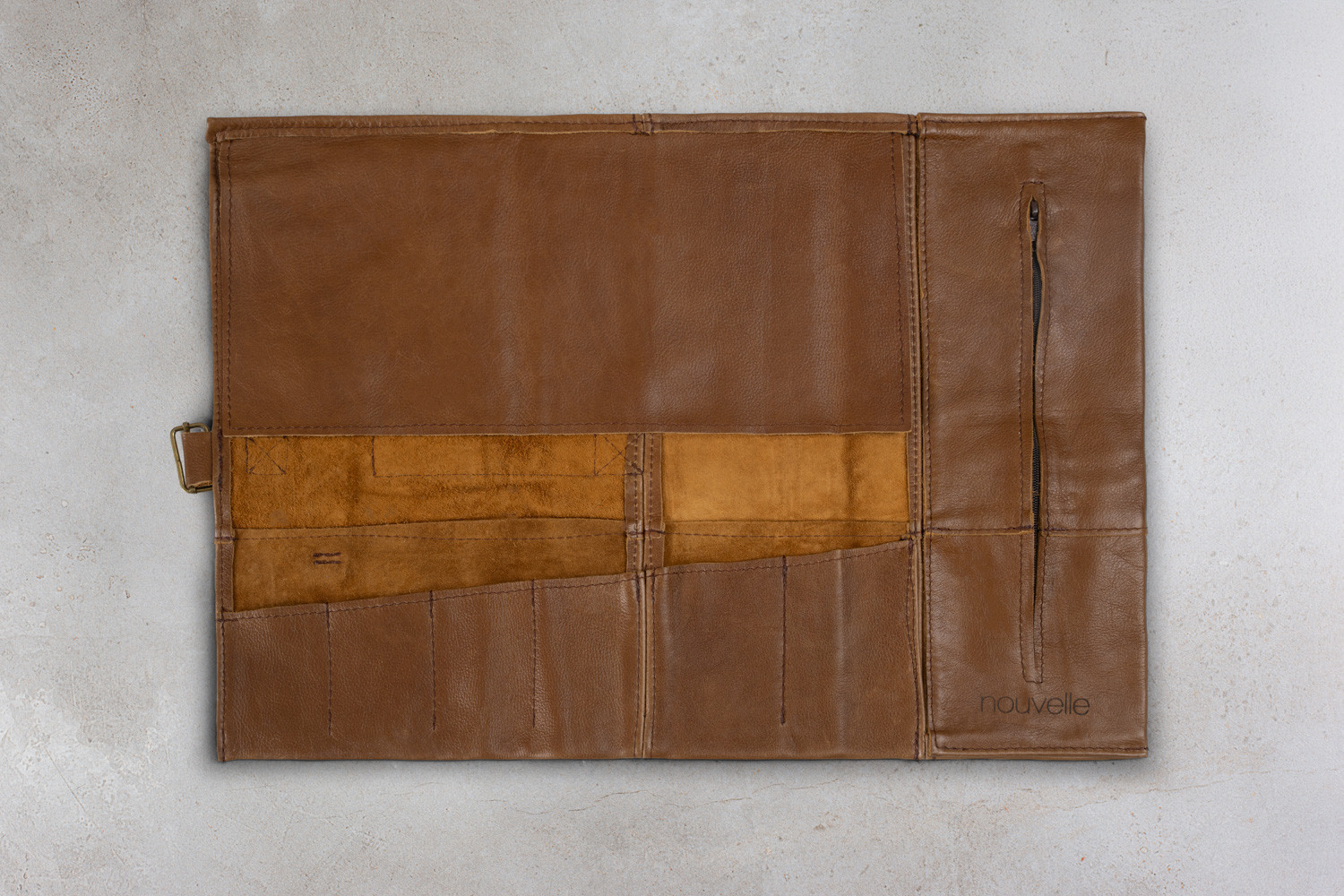 A premium Leather Knife Roll crafted for chefs, foodies, and braai masters who value order and elegance. The hand-finished full-grain leather features a soft lining that protects blades while individual pockets keep tools secure. It’s finished with an adjustable buckle strap and side zip pouch to add smart functionality.