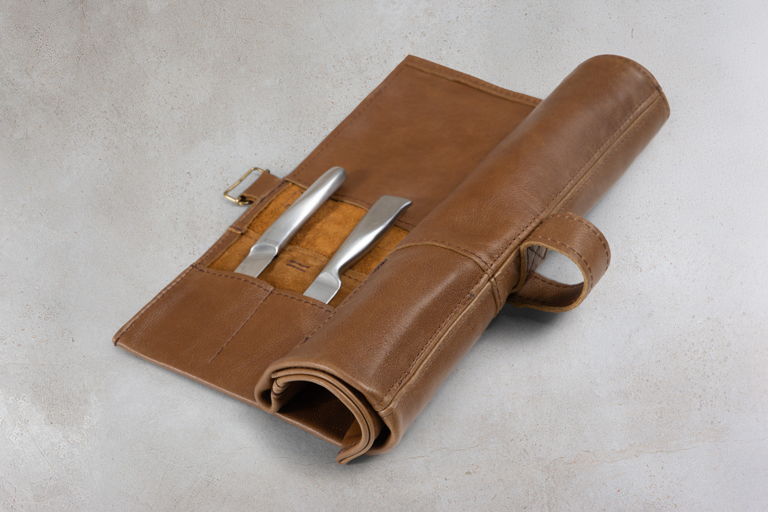 Designed for life around the kitchen and the outdoor braai, this leather knife organiser pairs timeless materials with purposeful detailing. The supple exterior develops a rich patina over time, while the interior sleeves cradle each knife to minimise clatter and edge wear. A wide protective flap prevents contact, and the sturdy belt-style closure keeps everything compact in your kit.