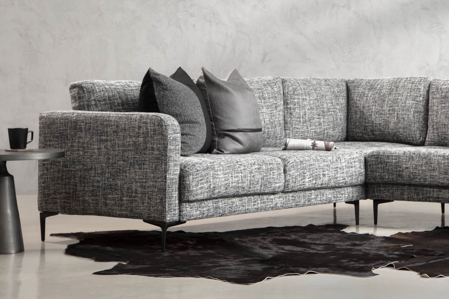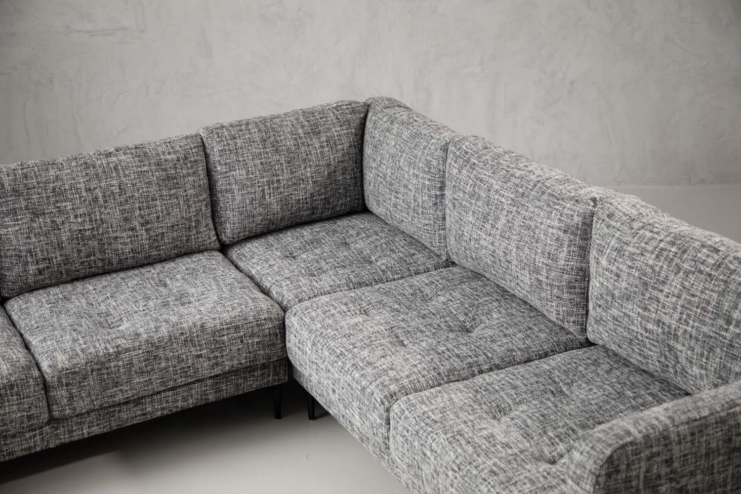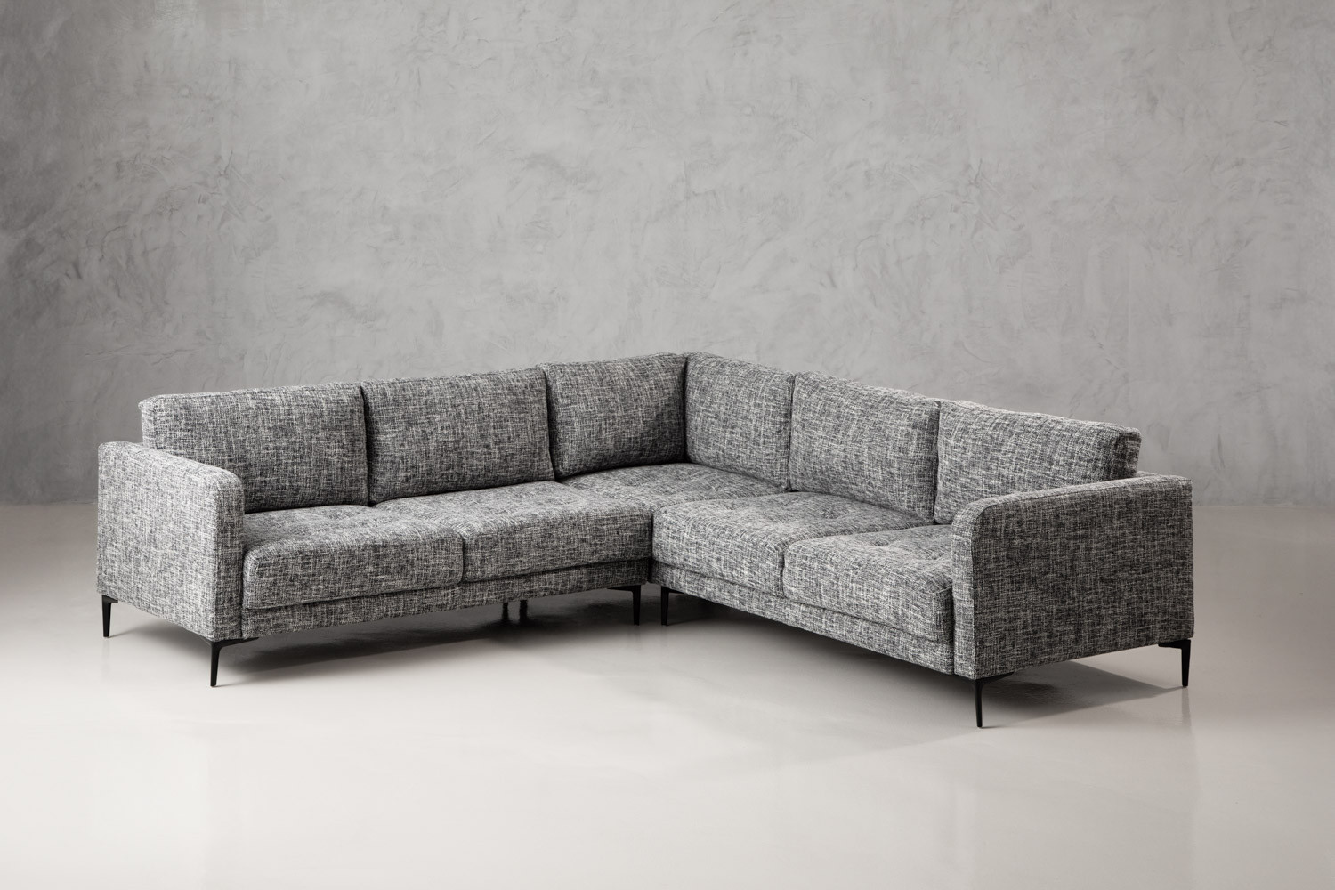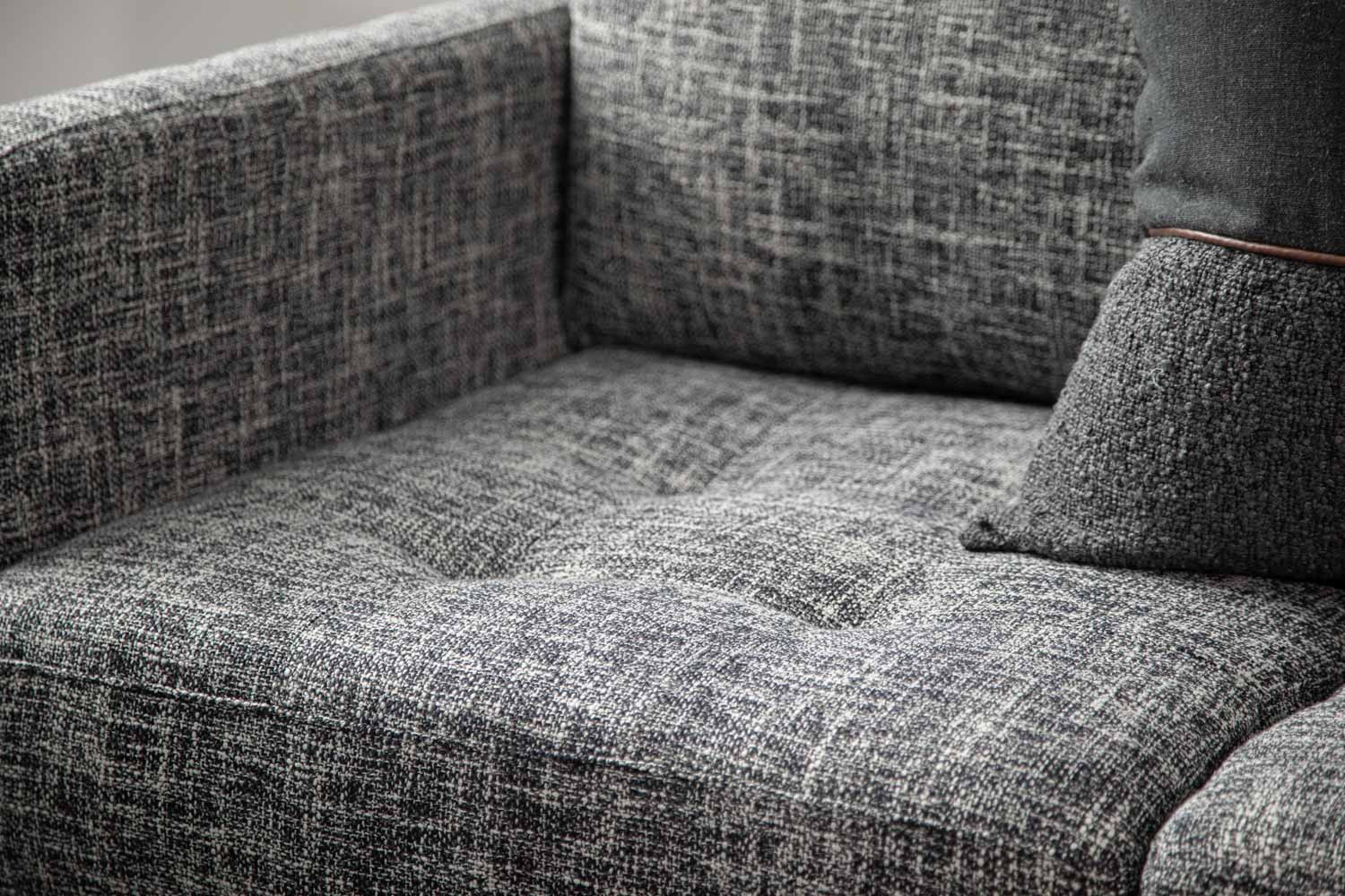 Add a rich sense of comfort to your living space with the Hayden Corner Couch. Upholstered in a textured fabric with charcoal tones, this opulent corner unit features an elegant modern design with distinctive stitching. The blind tufted seat cushions and tapered steel legs give the Hayden a unique character and charm.