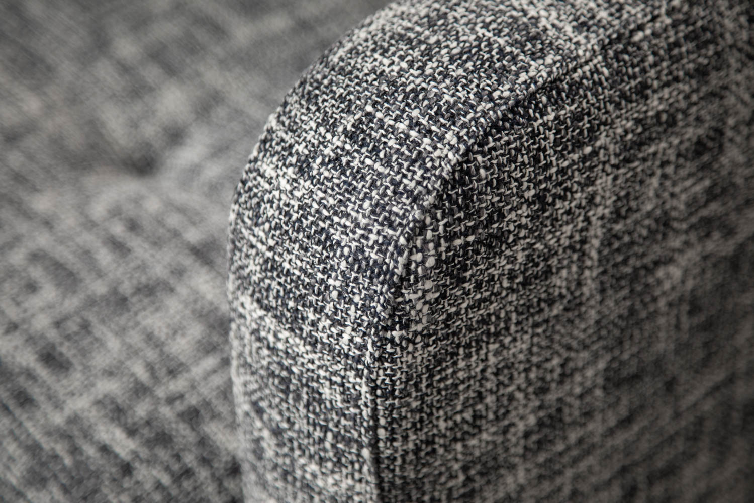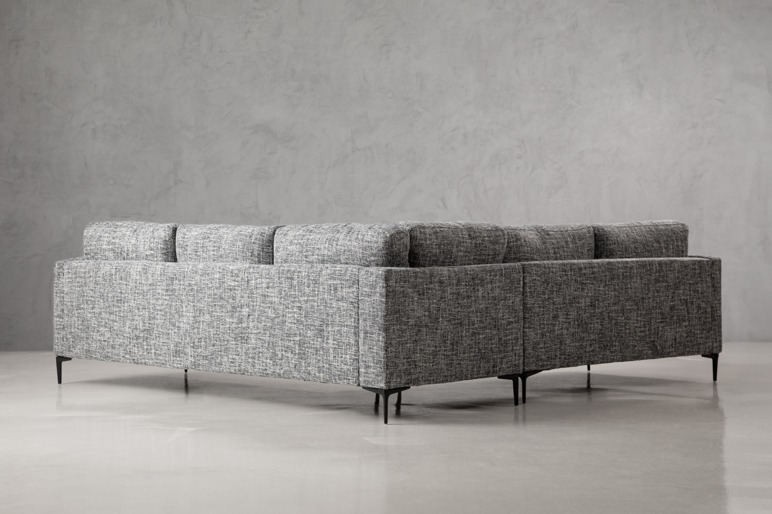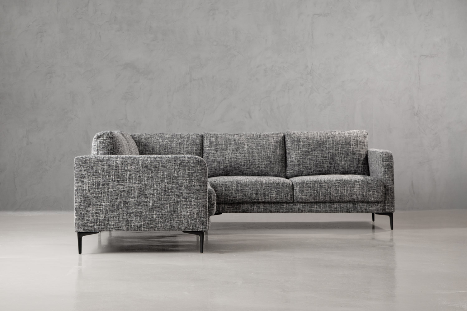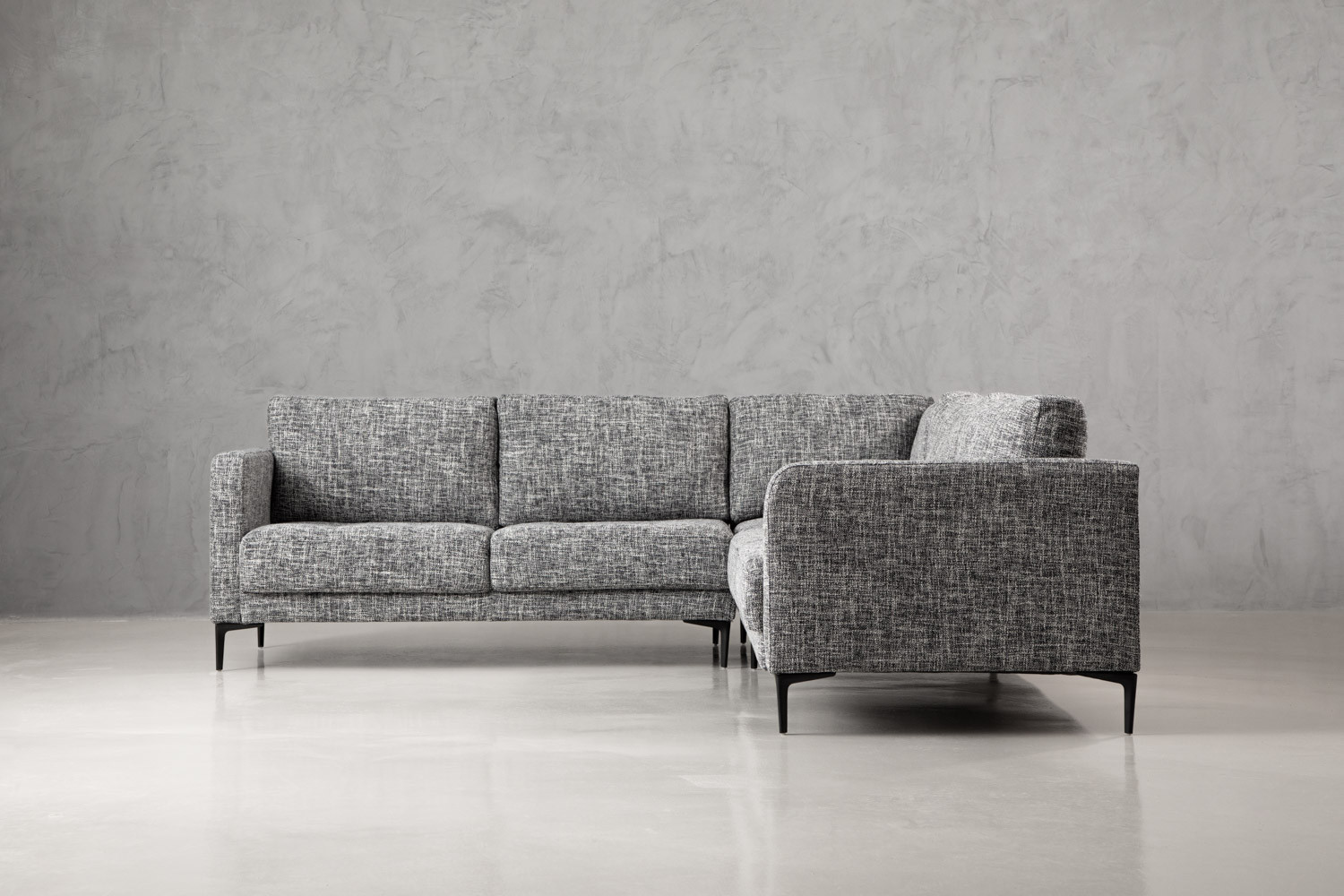 Add a rich sense of comfort to your living space with the Hayden Corner Couch. Upholstered in a textured fabric with charcoal tones, this opulent corner unit features an elegant modern design with distinctive stitching. The blind tufted seat cushions and tapered steel legs give the Hayden a unique character and charm.