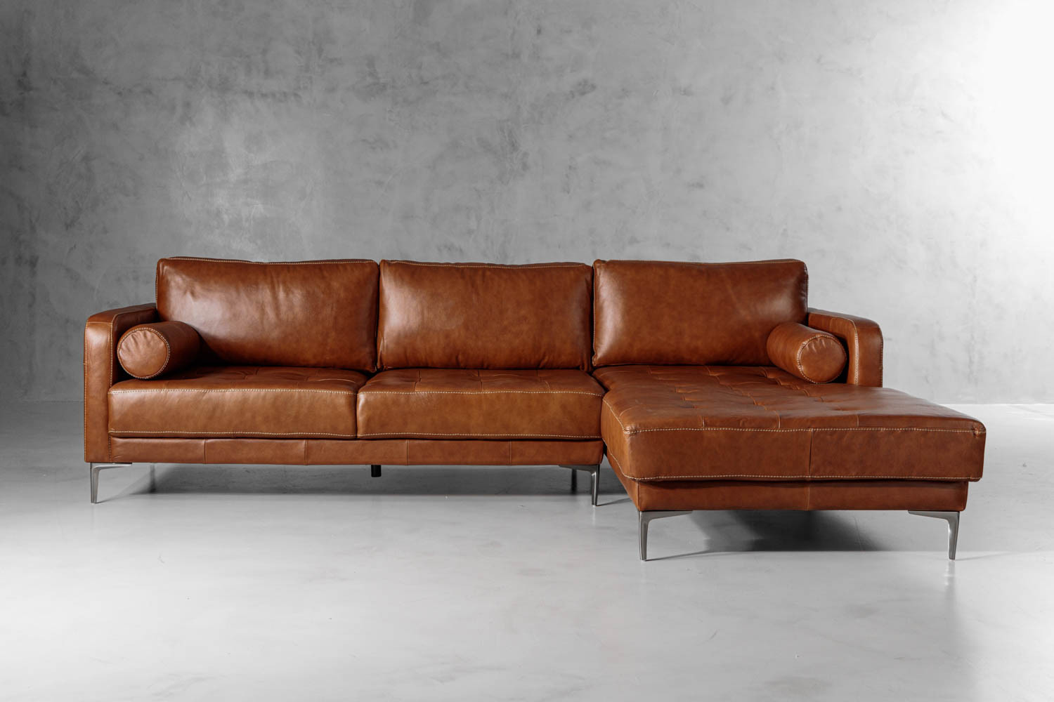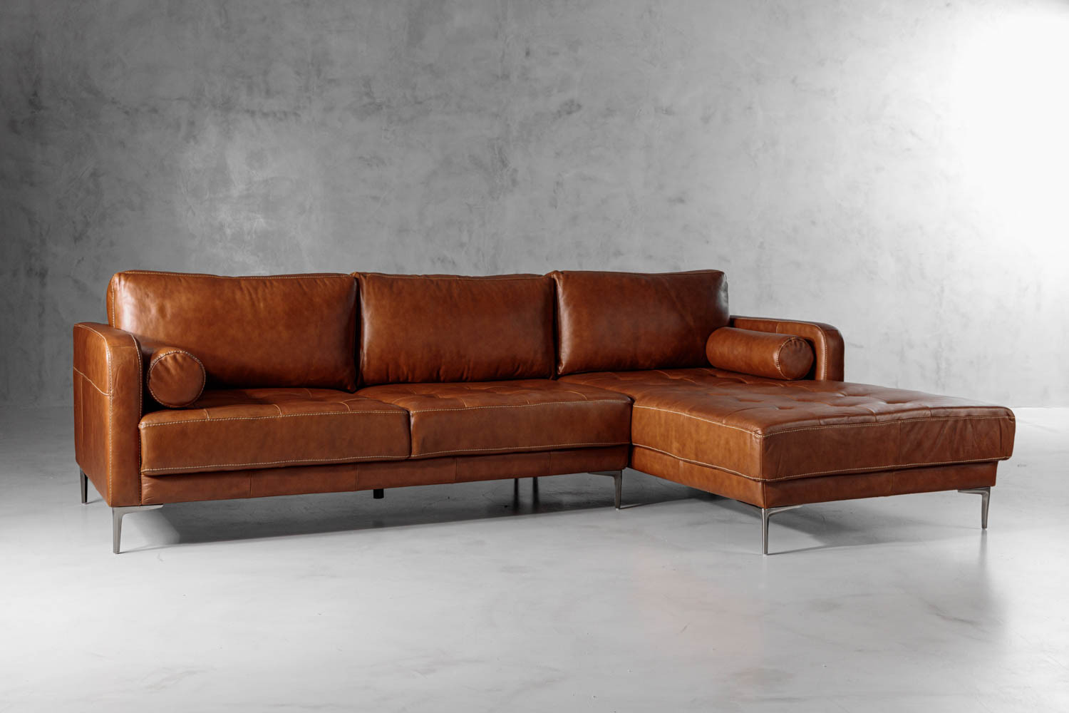 Add a rich dose of texture to your living space with the Hayden L Shape Couch upholstered in high-quality leather. This opulent couch features an elegant modern design, finished with distinctive stitching. The blind tufted seat cushions and tapered steel legs give the Hayden a unique character and charm.