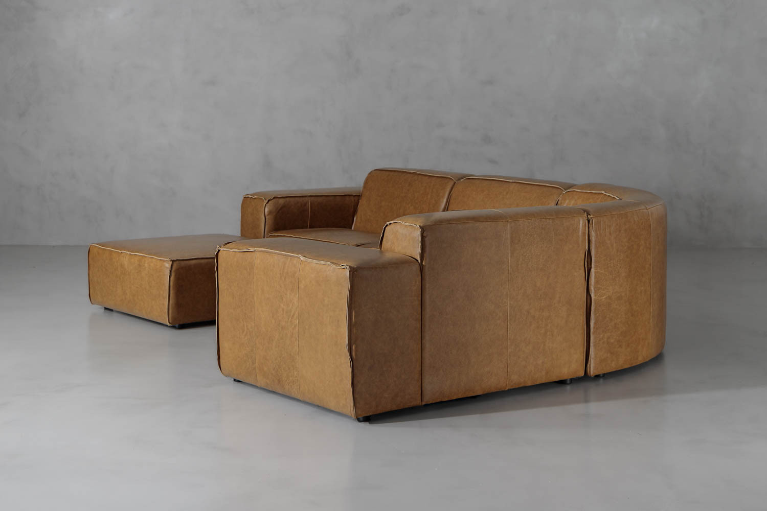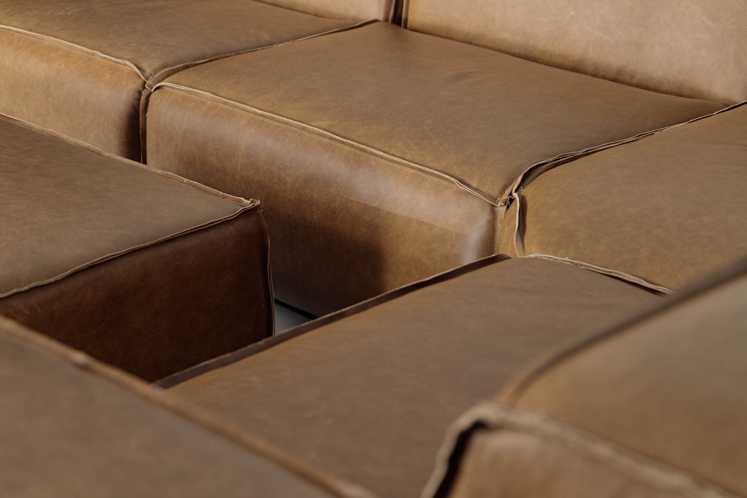 This Jagger Modular is a corner couch with independent moveable modules for various spacious seating configurations. Simply slide each piece into place and clip the attachment mechanism underneath the couch. This modular couch features an ottoman which matches the design of the couch. The Jagger presents a stylish homesteading staple with a raw untainted look. This is achieved by pairing the iconic reversed seam stitching with genuine full grain leather.