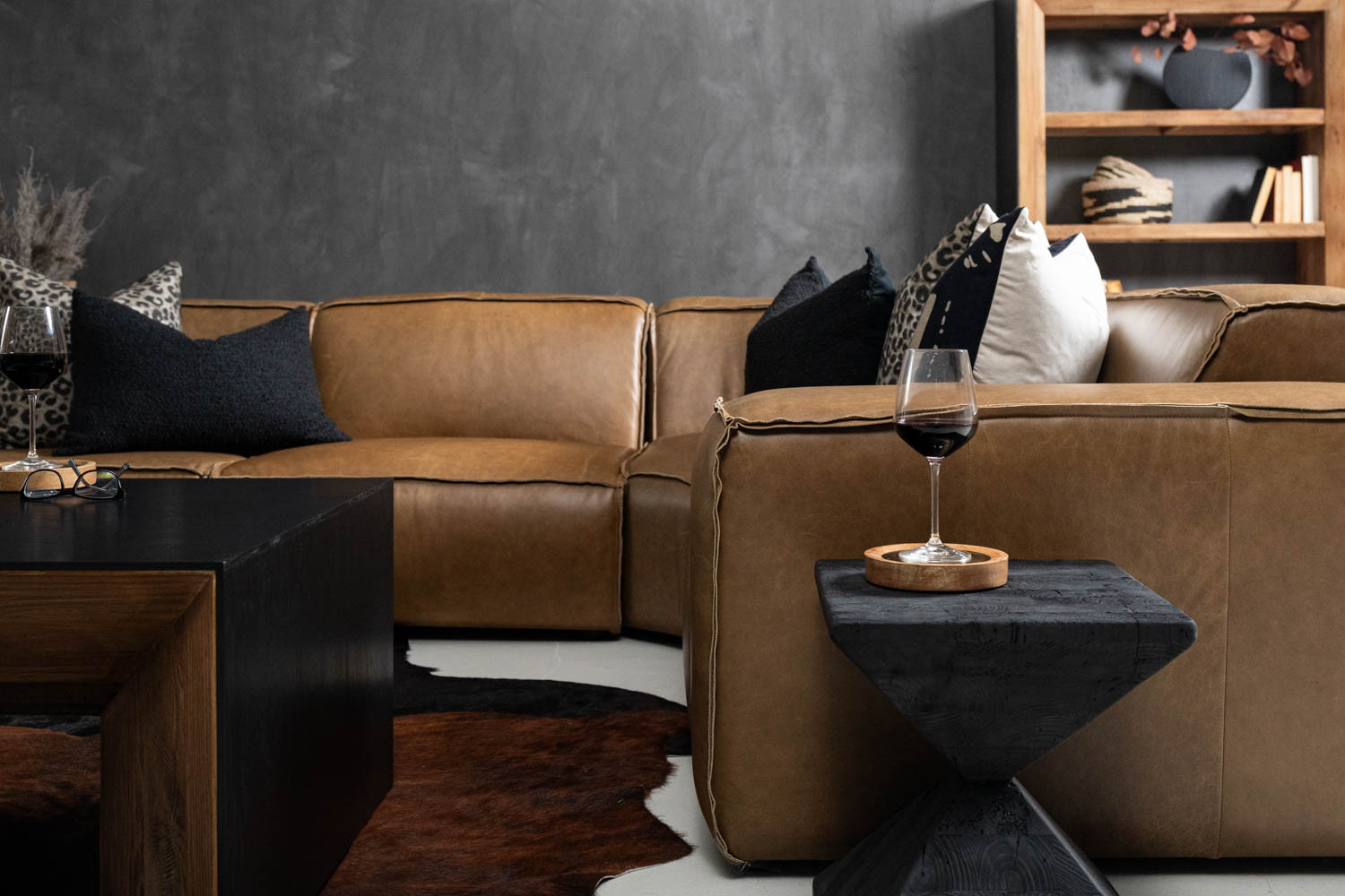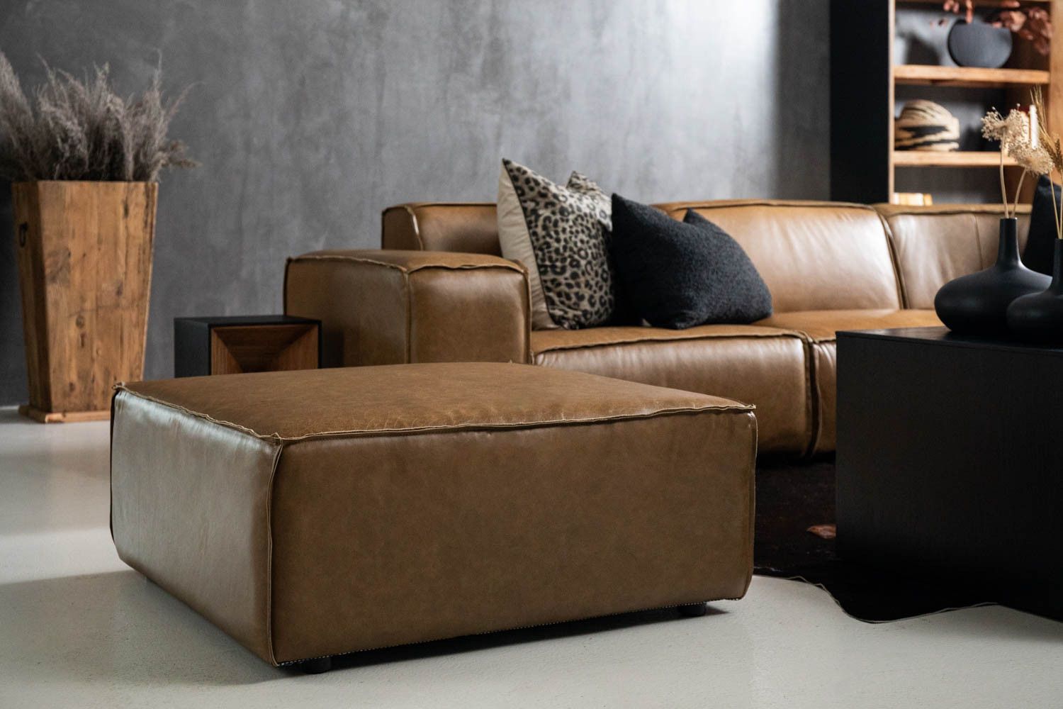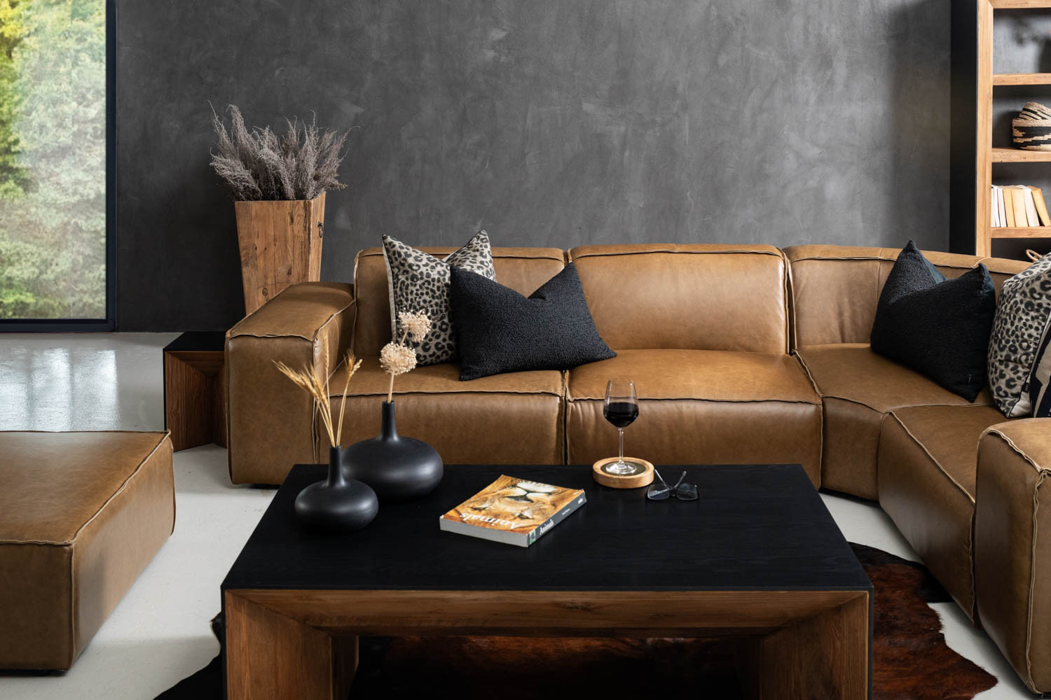 The Jagger Leather Modular Corner Couch With Ottoman boasts a bold contemporary design with a square-like silhouette, keeping the design simple but striking. With plenty of style and space, this modular couch is upholstered with luxurious genuine full grain leather, finished with reversed stitched seams to keep a natural raw look with a warm feel.
