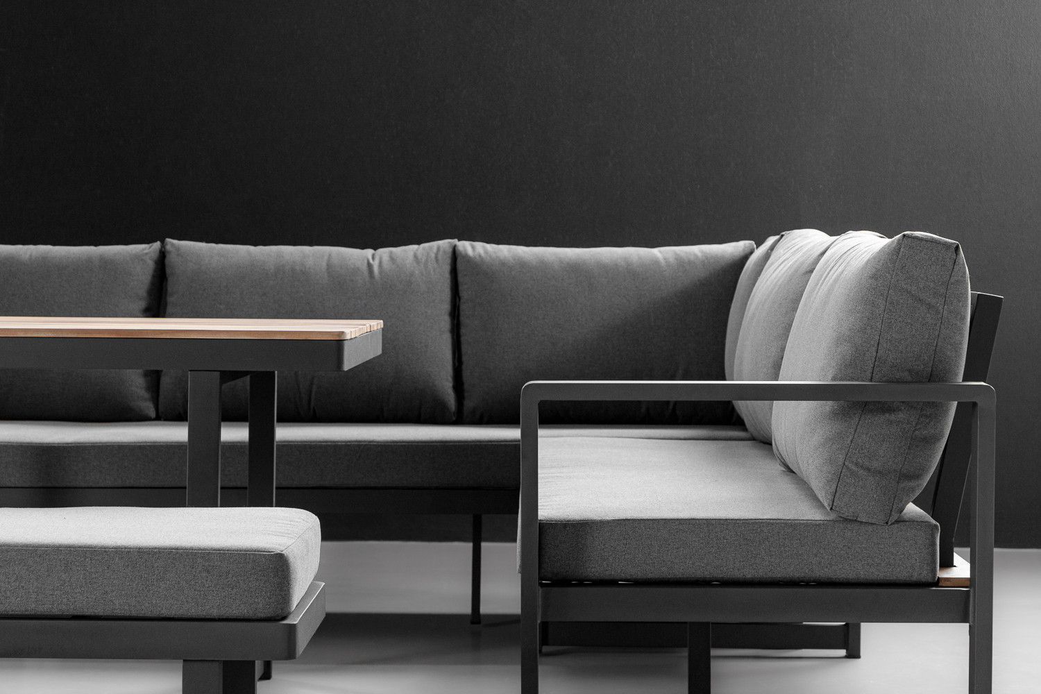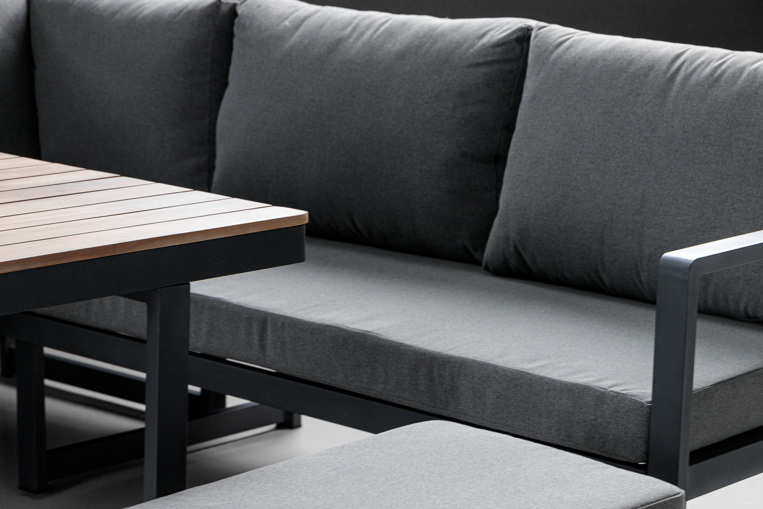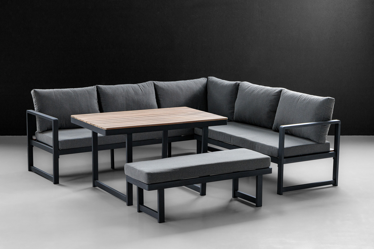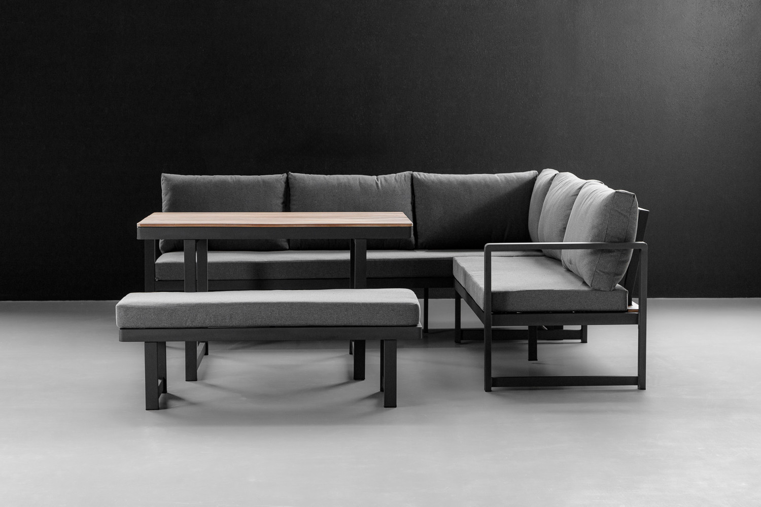 Designed for versatility, the Moscow Lounge Set includes a corner couch, two benches, and a rectangular table, offering a flexible layout that can be configured to suit your space. The set’s minimalist, rectangular frame detailing gives it a sleek, architectural aesthetic that elevates any patio. The plush removable cushions ensure that comfort and care are easy to maintain, making it ideal for outdoor lounging and dining.