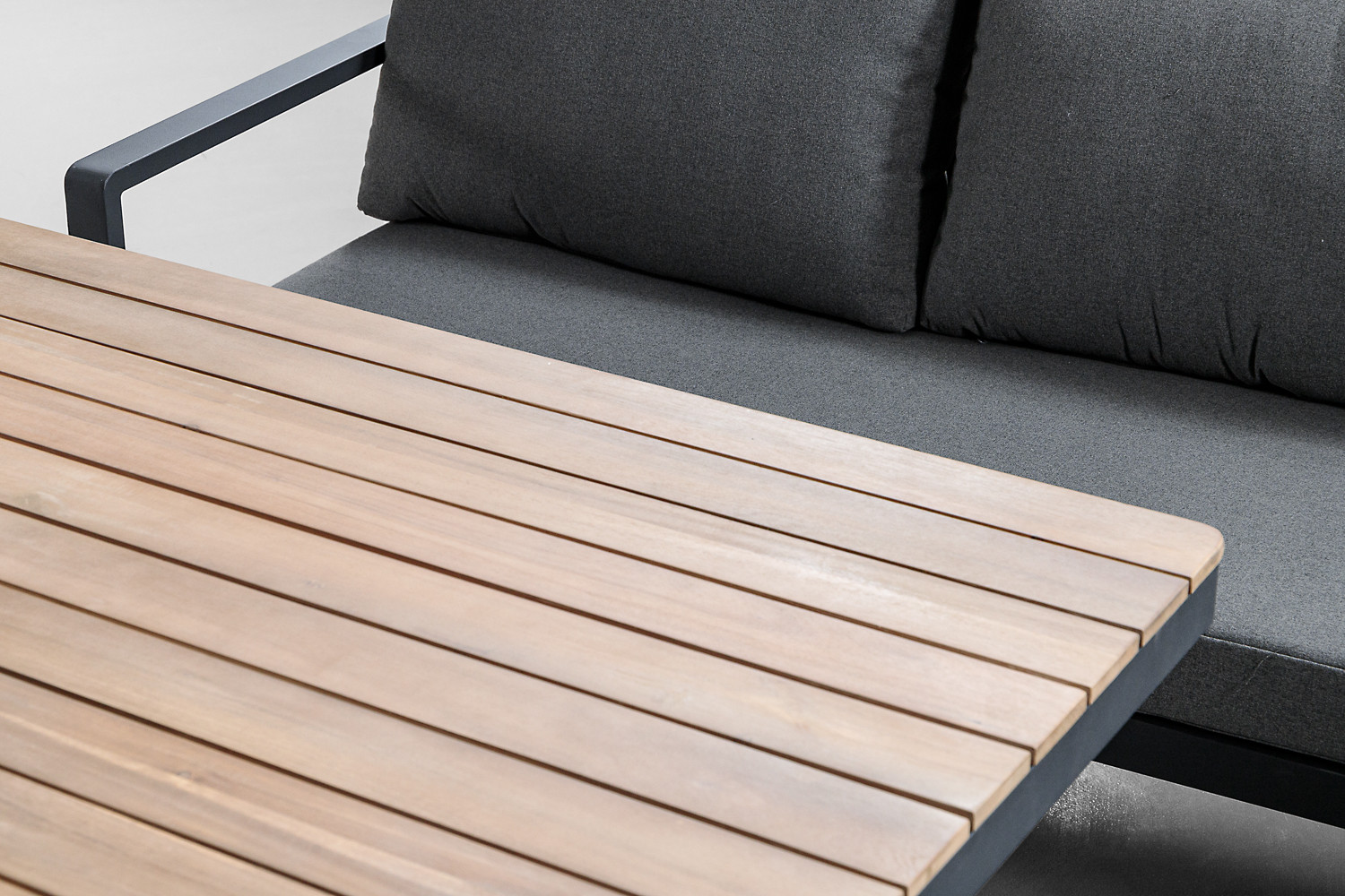 The Moscow Corner Patio Lounge Set is the epitome of contemporary outdoor living, blending modern design with functional comfort. This beautifully crafted set is made from solid acacia, known for its durability and natural beauty, and complemented by a striking powder-coated aluminium frame for a bold, modern look. The standout feature is the gorgeous, slated tabletop, which adds a touch of natural elegance to the set and makes it a perfect choice for those who appreciate fine craftsmanship.