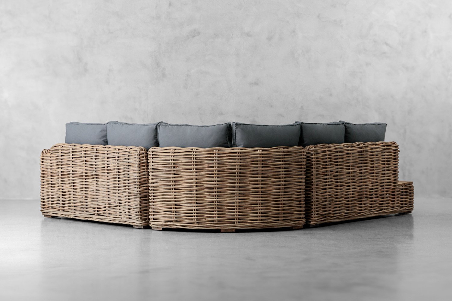 Transform your patio into an irresistible haven with the alluring Panama Corner Patio Lounge Set. This comfortable and spacious modular five-seater boasts rustic natural full CL rattan, plush and luxurious cushions with removable polyester covers, and a built-in wooden side table.