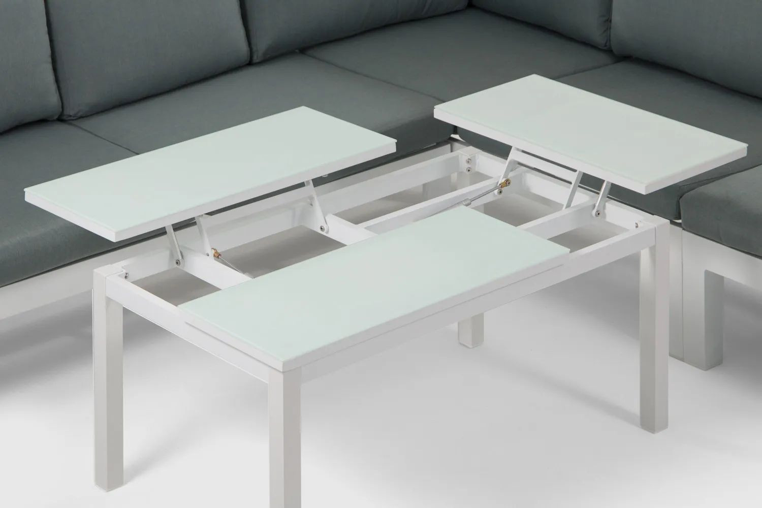 • The coffee table features two convertible panels, ideal for dining or working on a laptop