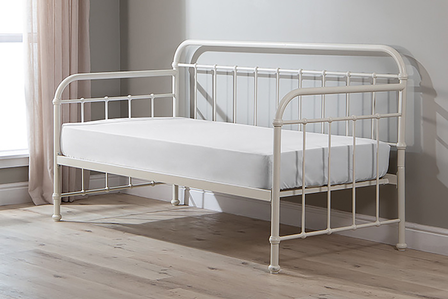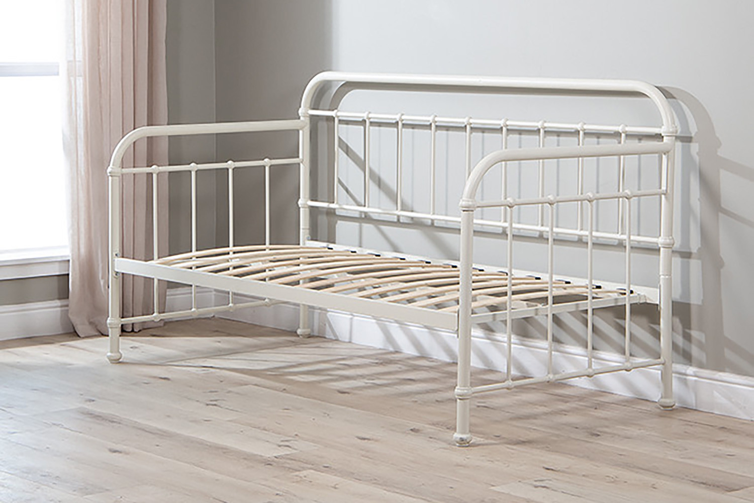 The Eralena Daybed, constructed from durable powder-coated steel and featuring sprung slats that provide ideal support for all foam mattress types, offers quality and versatility with the option to add a lower trundle bed to convert from a Single to a King size bed.