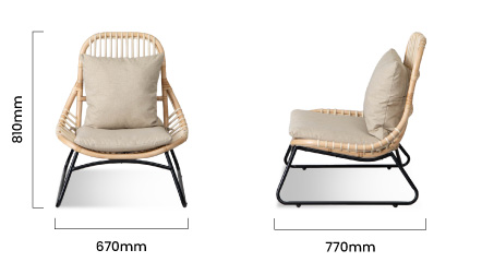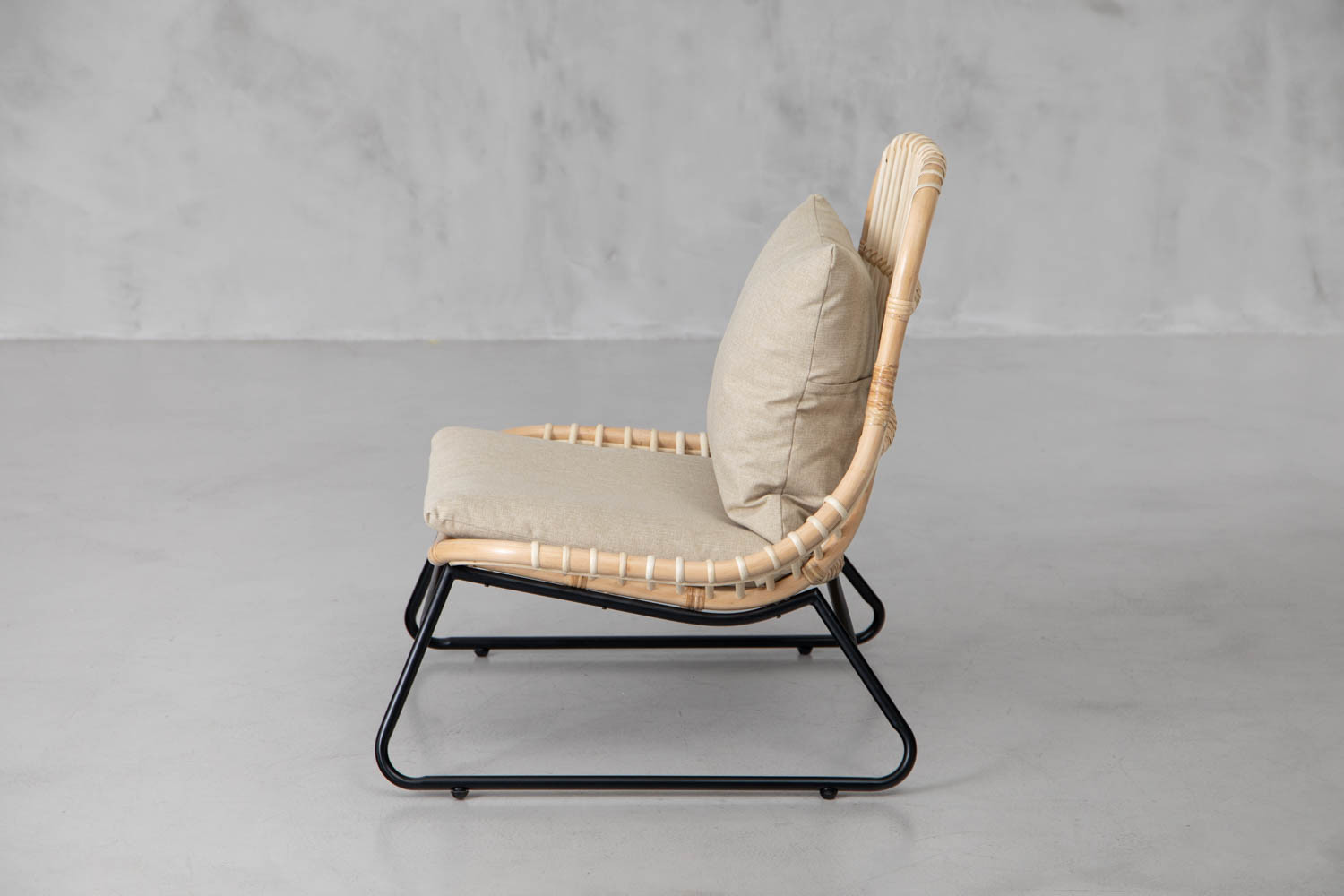 This chair is made in a natural rattan frame and features a durable fabric cushion with mild steel legs.